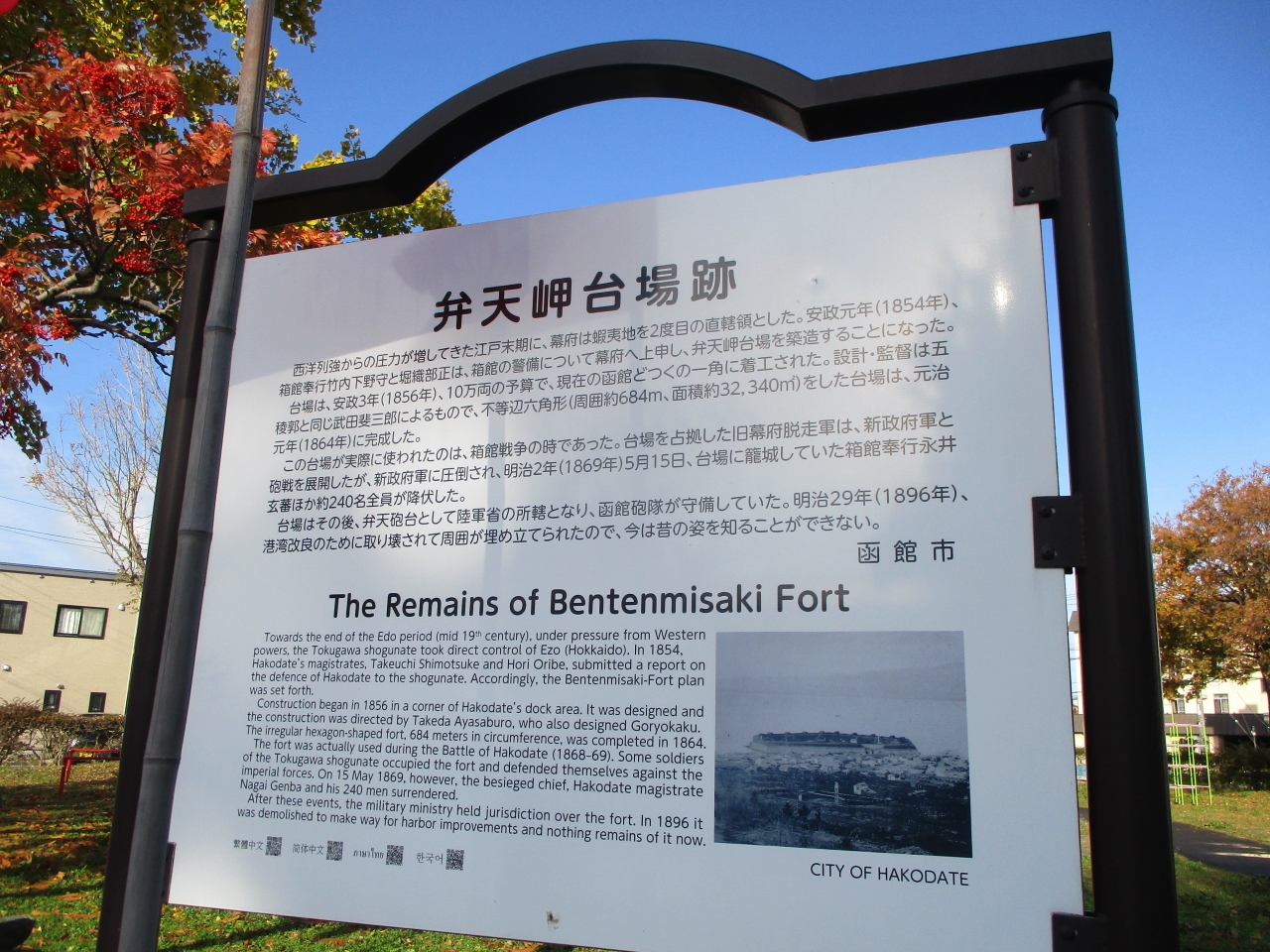 電停「函館どっく前」で下車して、すぐのところにありました。魚見坂の函館厳島神社の向かいあたりに案内板がありました。江戸末期に函館の警備の為に、ここに台場が設けられ、箱館戦争の際に実際に使われたそうです。