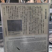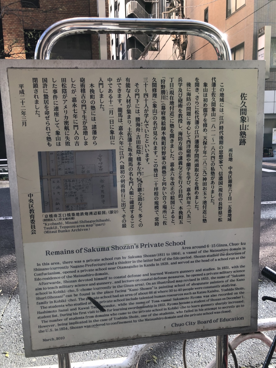 銀座みゆき通り沿いです。江戸時代後期の思想家である佐久間象山の私塾が、ここにあったそうです。現在は、案内板が設置されているだけで、当時の面影は何もありません。ただ、案内板には当時の古地図が掲載されているので、周辺の様子も伺い知れて興味深かったです。
