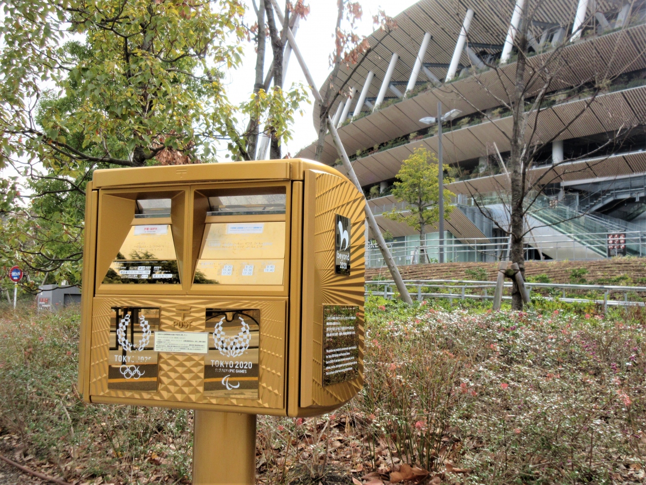 競技場の外に「ゴールドの郵便ポスト」がありました。東京2020オリンピック競技大会の開催を記念して設置されたようです。
