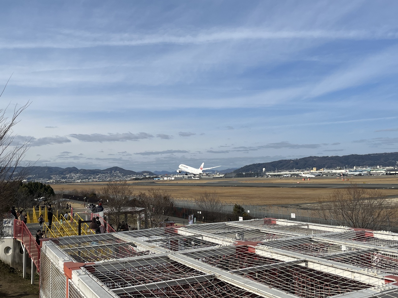 スカイパークは伊丹空港の滑走路に並行して造られているので、飛行機の離発着を真横から観ることができる公園です。遊具もたくさんあり、大人も子どもも楽しめる人気のスポットです。伊丹空港からのアクセスは、歩くと空港をぐるっと回る必要があり、遠いので、伊丹市駅行きのバスに乗りました。