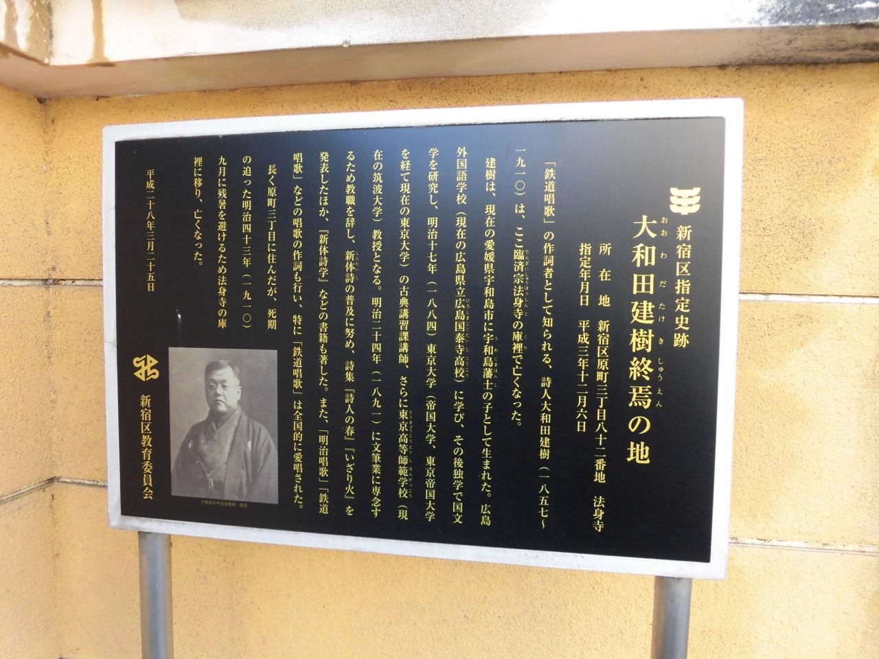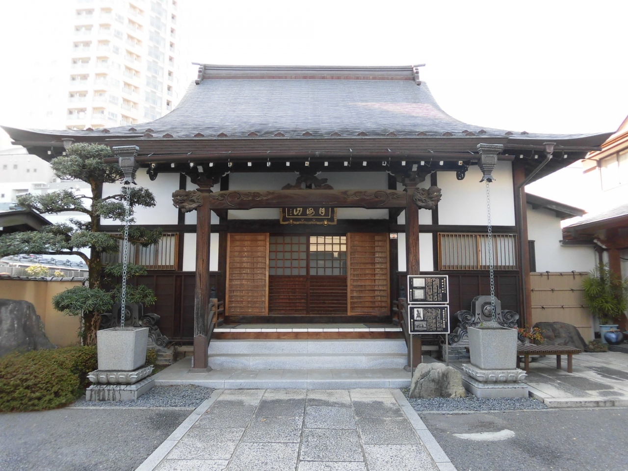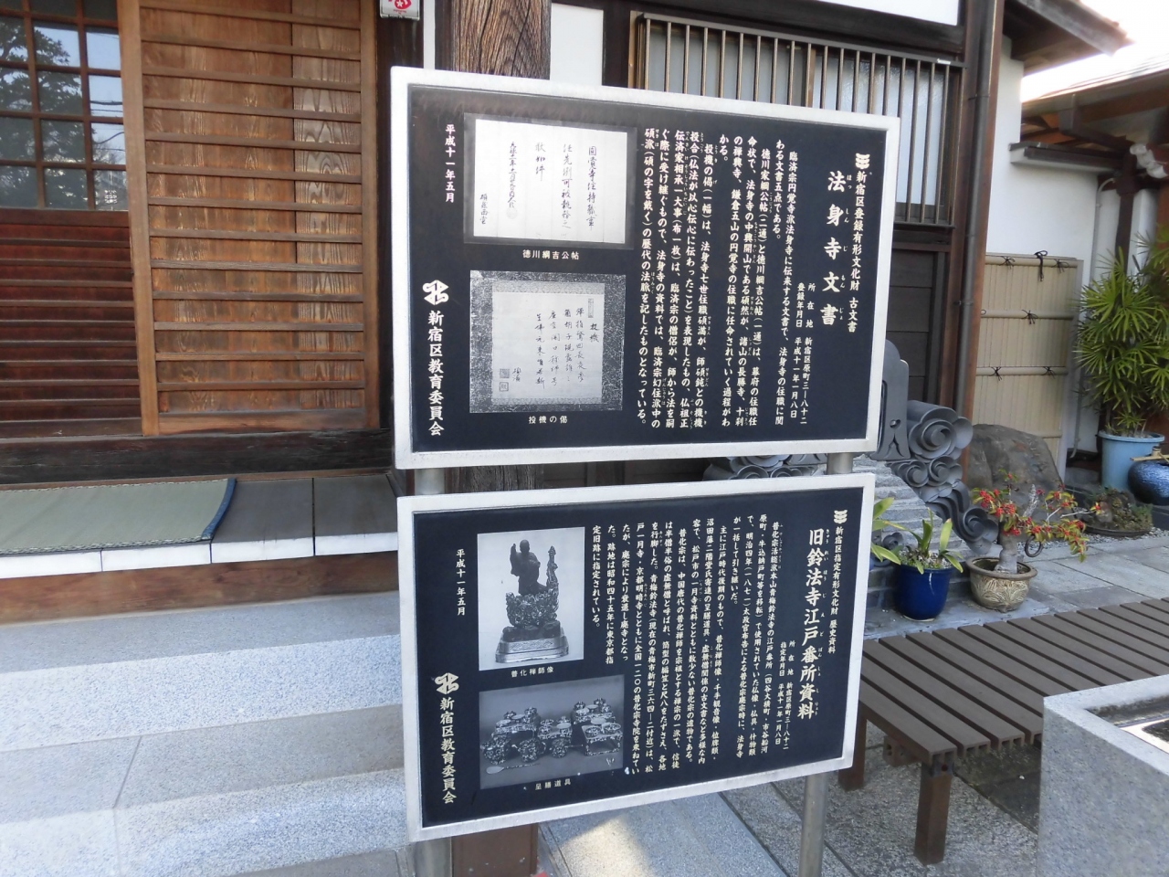 市ヶ谷柳町から若松町にかけて、お寺巡りをしながら散策しているときに立ち寄りました。子供のころから慣れ親しんだ鉄道唱歌の作詞者、大和田建樹のお墓があることを記した案内だったのでびっくりしました。また本堂脇の案内板では、江戸時代の古文書や仏具が所蔵されている旨の記載があって、古くからの歴史あるお寺だと思いました。