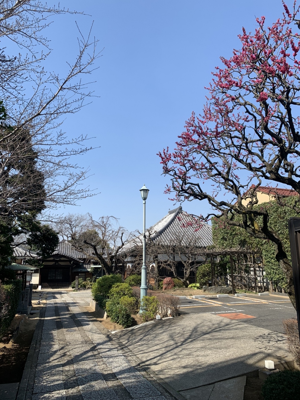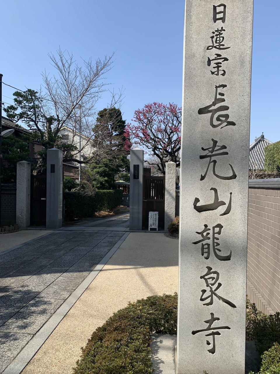日蓮宗のお寺のようで、石柱に寺の名前が堂々と描かれています。