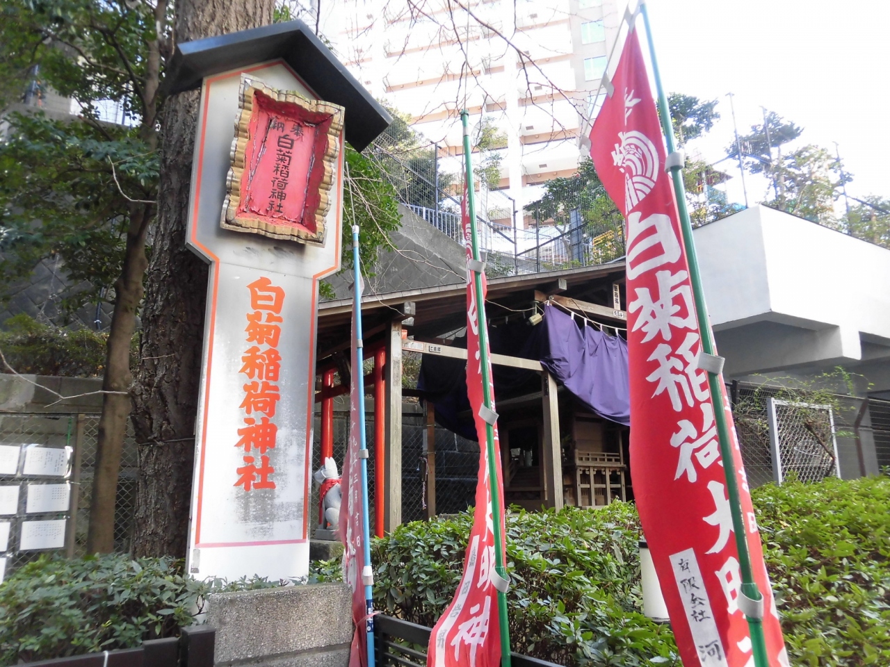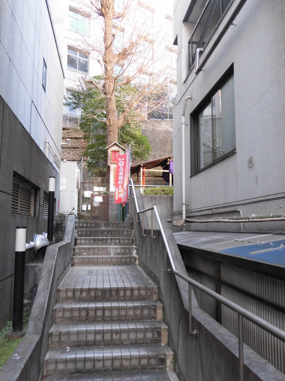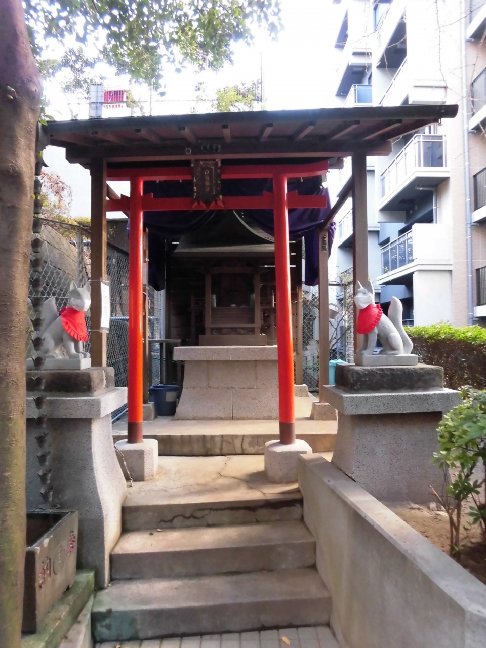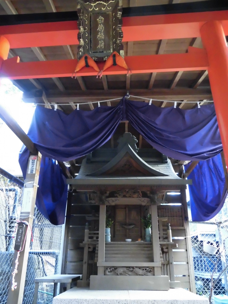 飯田橋駅近くで稲荷神社を見つけたので立ち寄りました。何か考え事をしていたら見過ごしてしまいそうな、細い路地の奥に小さなお社がありました。お社の向きも横向きなので、狭い敷地で正面を向いてお参りするのが大変でした。お社を覆うように飾られている青い垂れ幕がきれいだと思いました。