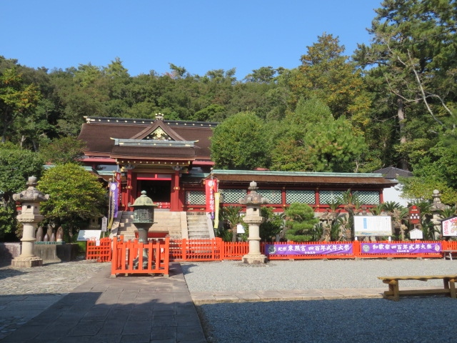 境内に入って、最初の社務所のような建物に「和歌祭四百年式年大祭」の看板があり、お祭りムードが漂ってました。本堂は、ここからかなり長く、かつ急な階段を上っていきます。赤い柱が随所にあり、こげ茶の茅葺風の屋根も威厳があって素晴らしいものでした。