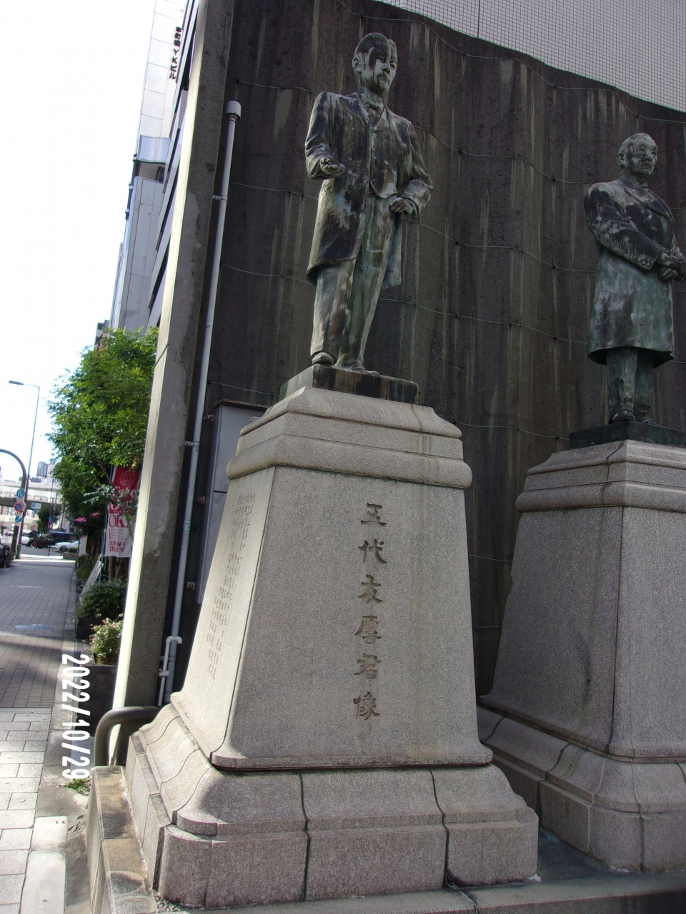 この大阪商工会議所・五代友厚像は明治11年に創設された大阪の商工会議所の前身の場所にあります。隣はかつては西町奉行所でもあります。地下鉄大阪谷町線谷町四丁目駅から西北に5分程度の場所にあります。像は青銅づくりでほかのかかわりの人と今も会議所を見つめて