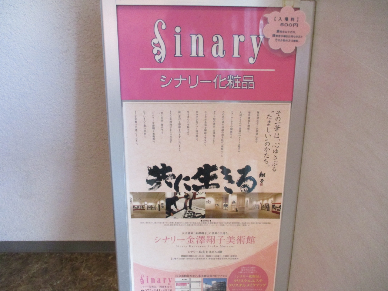 京都駅前の烏丸通りを北に行くと東本願寺がありますが、その手前の交差点角・烏丸七条ビル(シナリー化粧品が入っているビル)の3階に美術館があります。書家、金澤翔子さんの作品が展示されています。ビデオも放映されていて座って見れます。静かな空間でゆっくり鑑賞できました。素晴らしい書に感動しました。
