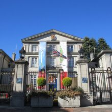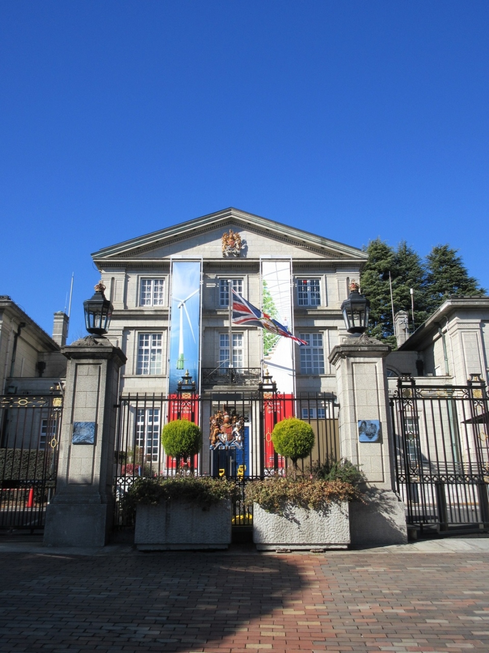 半蔵門駅周辺を散策した際、こちらのイギリス大使館に立ち寄りました。外観のみの見学でしたが、ヨーロッパの貴族の館と見まごうばかりのシンメトリーの重厚な建物で、中央の建物ファサード上部にはイギリスの紋章も掲げられていました。むろん警備の方はいますが、正面からの写真撮影は全く問題ありませんでした。