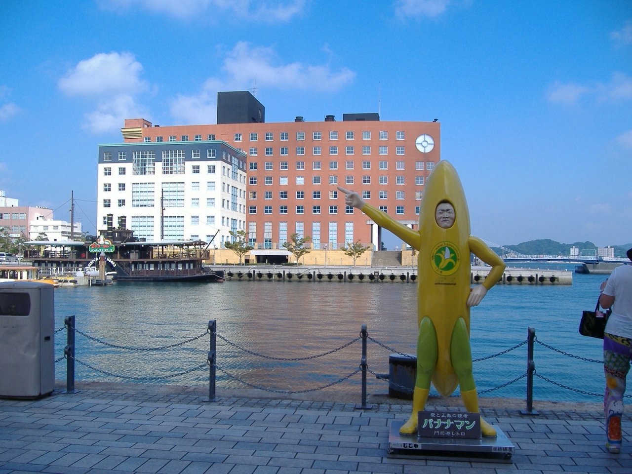 門司港レトロ地区のJR門司港駅前(旧門司三井倶楽部側)に『バナナの叩き売り発祥の地』の記念碑が建っており、バナナマンの像は、門司港レトロの中核施設、 海峡プラザの前にバナナの叩き売りで有名な門司港のイメージキャラクター、バナナマンの像がありました。