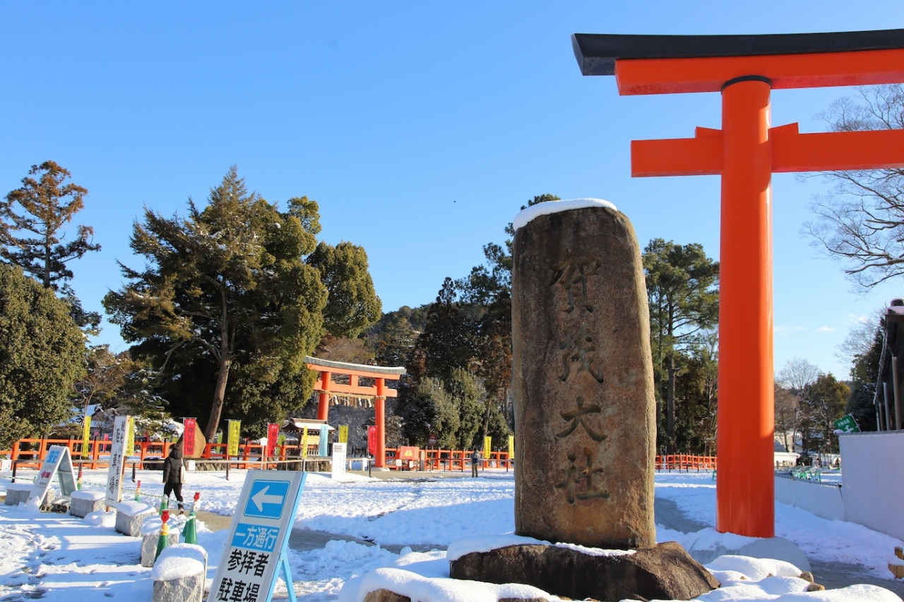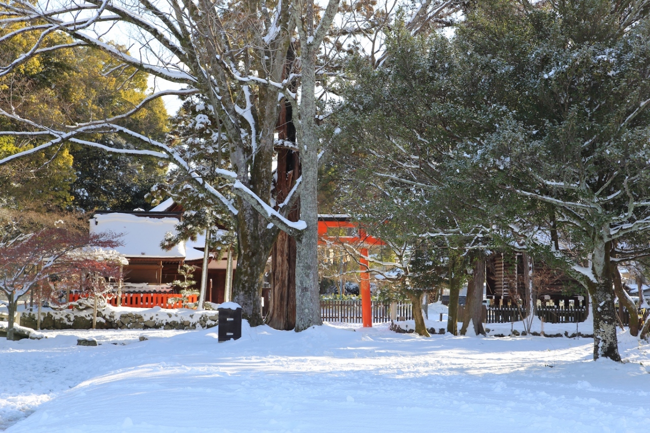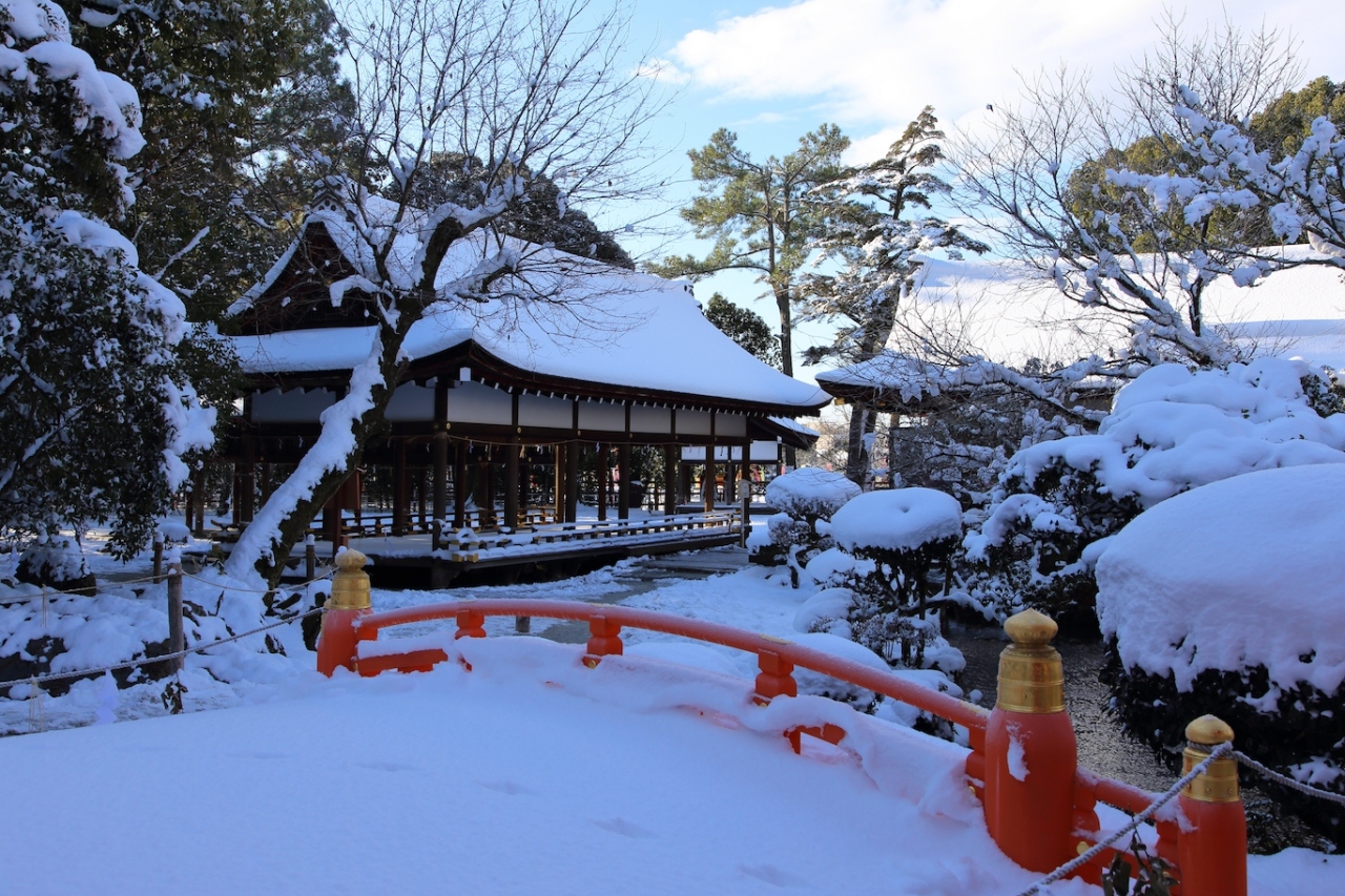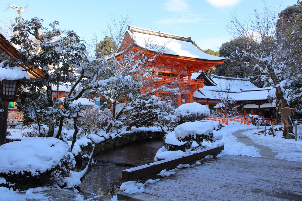 京都に大雪の降った翌日、市内中心の雪はほとんど溶けていましたが、北に行けば残っているかな、と思って訪ねてみました。結果は正解で、参道の雪かきはされていたものの、十分に満足のいく雪景色を見られました。特に、橋殿の辺りからは一面の雪と赤い玉橋と楼門、青空が素晴らしい景色を作り出していました。次の機会がいつ来るかは判りませんが、次回はもっと雪が降り積もった時に訪ねてみたいですね。
