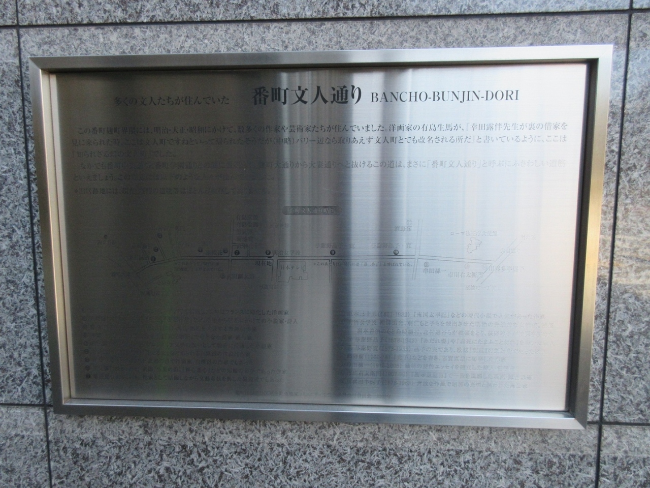 四ツ谷駅からほど近い番町からローマ法王庁大使館にかけての通りが【番町文人通り】と名前が付けられており、明治から昭和にかけてこの地に足跡ととどめた泉鏡花や有島武郎、菊池寛、与謝野鉄幹・晶子夫妻などの旧居を示すプレートが道沿いにいくつも設置されていました。通りそのものはマンションや住宅のある細くて狭い道路で、これといって特筆すべきものはありませんでした。文人の生活した建物でも残っていれば良いのですが、そうではないので期待しすぎない方が良いですね。