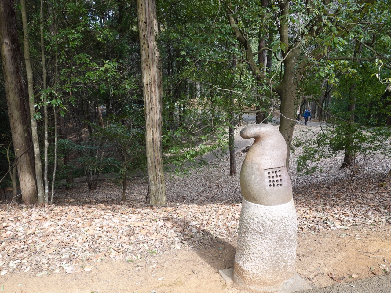 広大な敷地を有する「笠間芸術の森公園」は、いくつかのエリアに分かれています。「工芸の丘」ではフリーマーケットが開催されており、多くの人で賑わっていましたが、そこから200メートルほど東へ進んだ「陶の杜」は、人の姿もまばらで静かで落ち着いた散策コースでした。アップダウンに富んだ道沿いのところどころに陶芸作品が設置されており、緑に囲まれてのウォーキングが心地良かったです。3月初旬だったので彩りに欠けたのは少し残念な点でした。
