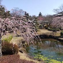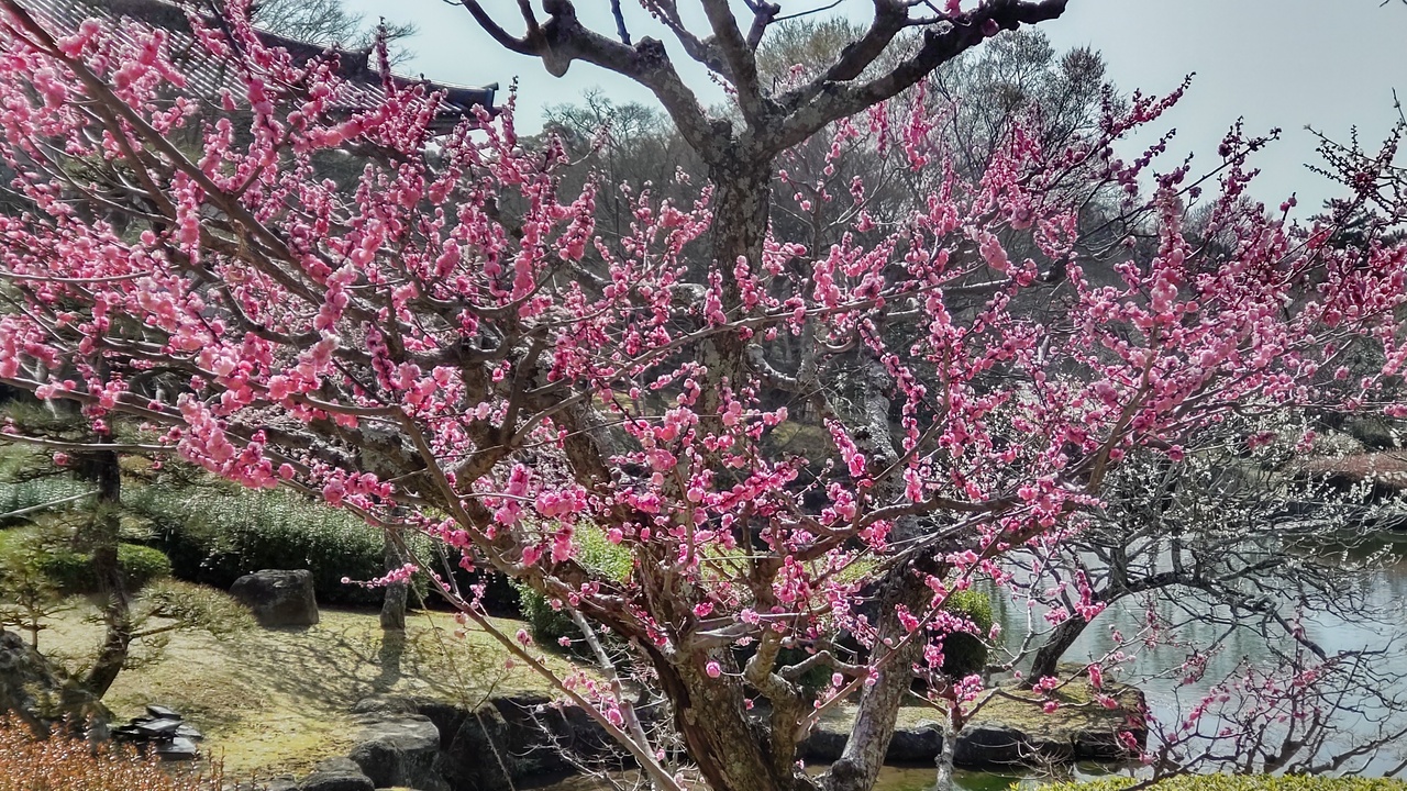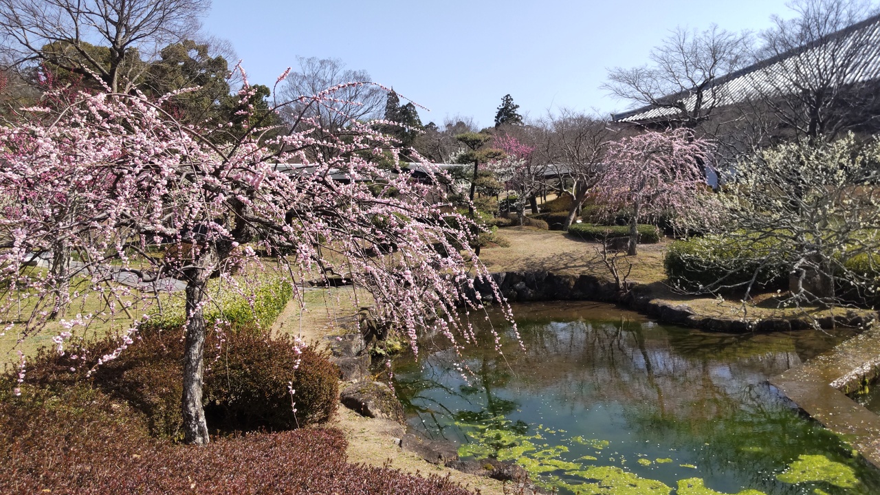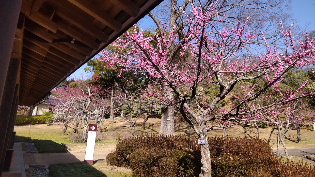 重ーいドアを開けて中に進み、庭園にでます。左手に綺麗な梅がさいています。