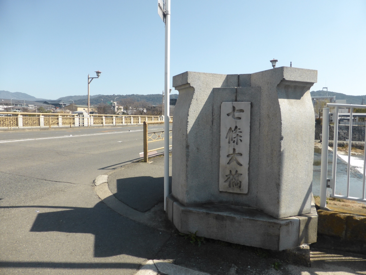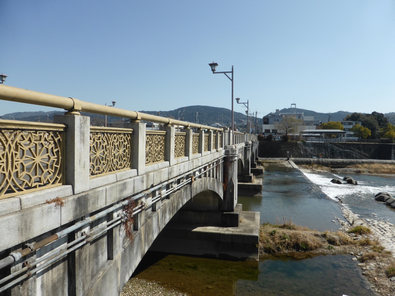 明治44年着工、大正2年竣工し、現在鴨川に架かる最古の橋です。鉄筋コンクリート造五連アーチ橋、当時としてはモダンなデザインで、1987年に改修された高欄には三十三間堂の通し矢(10本の矢が円の中心の的に向かっている図)になっています。京都らしい風情ある橋です。