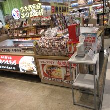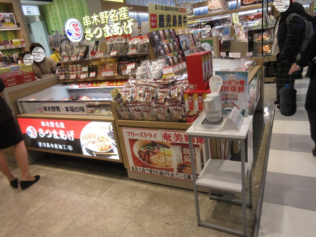 店内には「さつまあげ」「焼酎」など、鹿児島の名産品が勢ぞろい。出発前に土産を買い足すのに便利です。