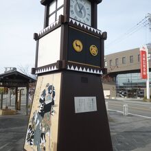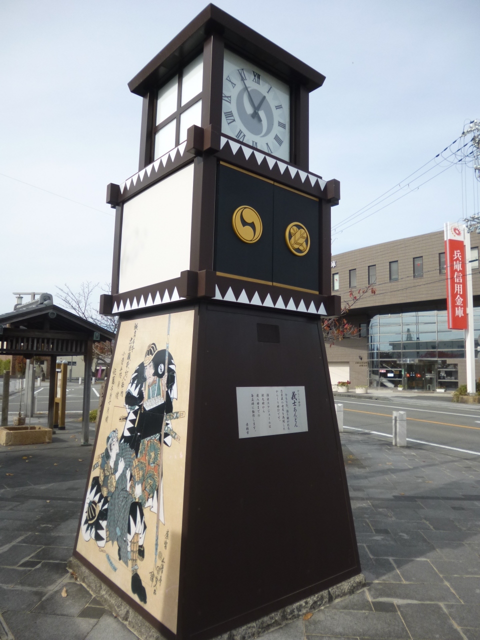 赤穂城跡の公園からお城通りを東北にまっすぐに行ったところ、ポケットパークのようになったところに義士あんどんがあります。高さ4m程のからくり時計で、毎正時になると、義士の音楽と共に扉が開き、からくり人形が忠臣蔵名場面を演じます。