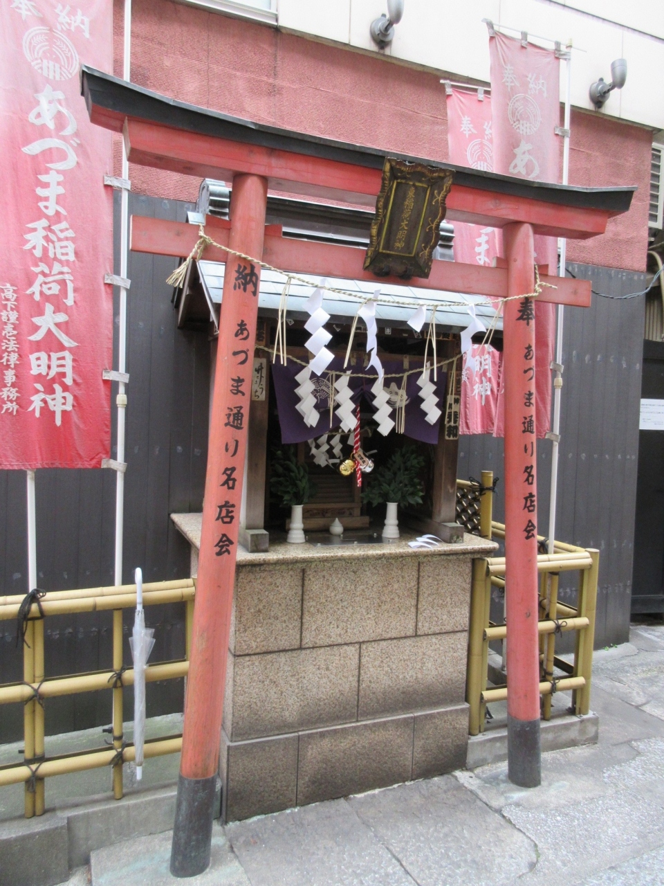 銀座界隈を散策し、中央通りから一本東側のあづま通りまで足を伸ばしたところ、小さなお稲荷さんがありました。小さいながらもしっかりと赤い鳥居や社殿のような立派なお社(とは言ってもミニチュア版)があり、榊などもしっかりとお供えしてありました。