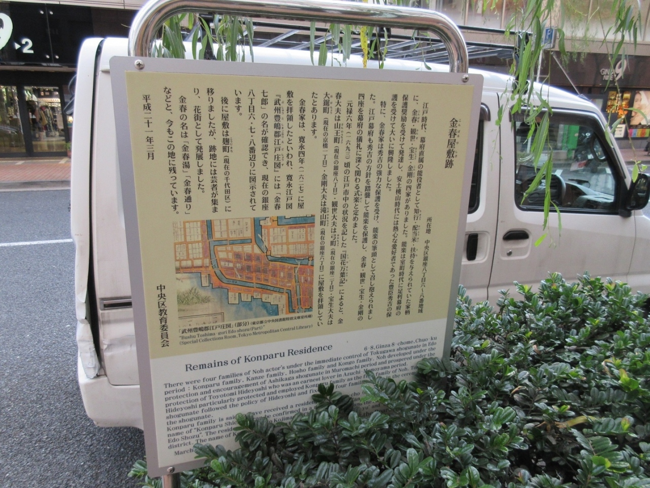 銀座を散策し、金春通り界隈を歩いている時に【金春屋敷跡】を示す説明板が設置されていました。中央区もこうした歴史遺構の保存に力を入れているのか、道路わきの植え込みに設置された畳半畳ほどの大きな説明板は、遠くからでもすぐに分かりました。しかも古い古地図も利用して分かりやすく説明されており、それによると江戸時代に幕府直属の能役者が4家あって、その中の一つである金春家の屋敷跡がこちらだと記載されていました。銀座は江戸の昔から華やかな街だったのかもしれません。