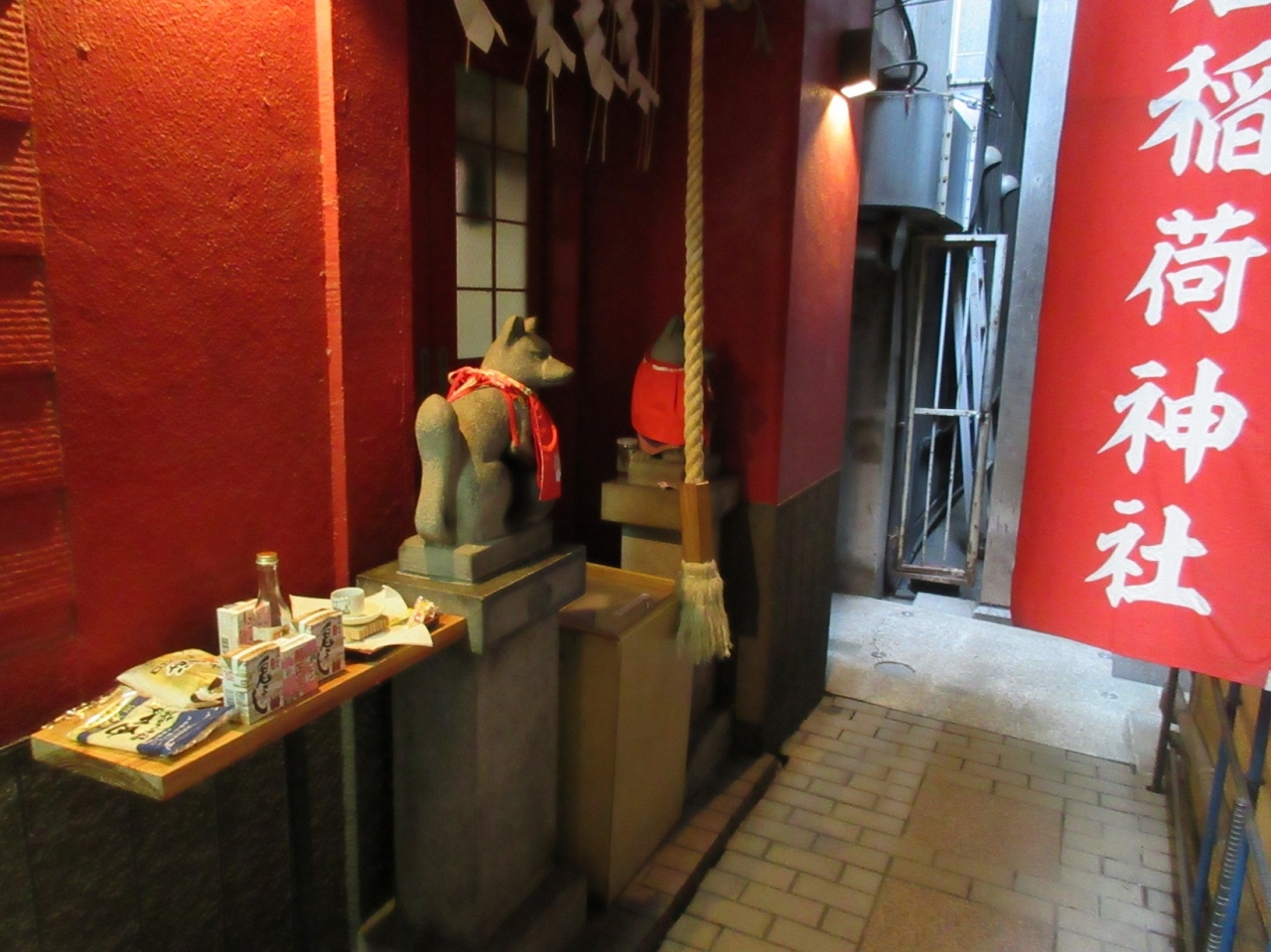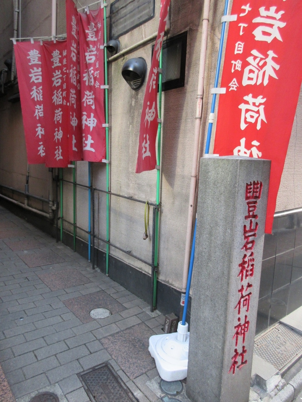 銀座を散策し金春通りを歩いて7丁目まで行った時、右手に【豊岩稲荷】と書かれた石碑を見つけました。歩行者がすれ違うのさえ難しいようなビルの間の細い通路の先に、なんとしっかりとお稲荷様が鎮座しているではないですか。商売繁盛とお稲荷様信仰が結びつくのは分かりますが、さすがにここまで無理してご安置しなくても良いのではないかと思えてきました。お供えのパック入りの日本酒など、むしろ寂しいではないですか。