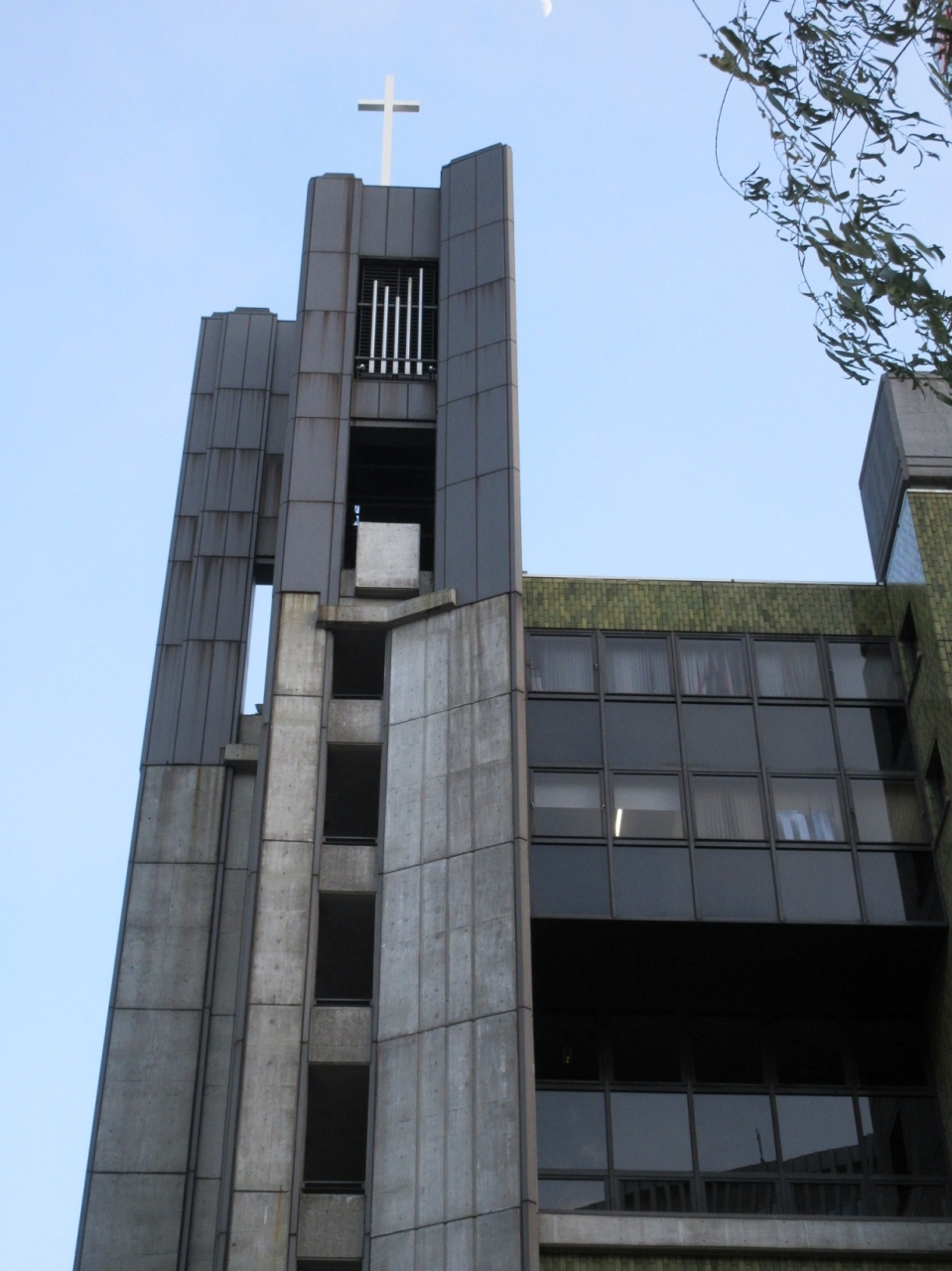 銀座周辺を散策した際、有楽町駅にほど近い外堀通りに面したコンクリート打ちっぱなしの教会を見つけました。最初は普通のオフィスビルだと思ったのですが、【日本基督教団銀座教会】と書かれたプレートが壁面に設置されていて、それが教会だと分かった位です。ただ、道路を渡って有楽町駅そばから振り返って見上げると、確かに屋上に銀色に輝く十字架が立っていました。デザイン面でとても斬新な教会で印象に残りました。