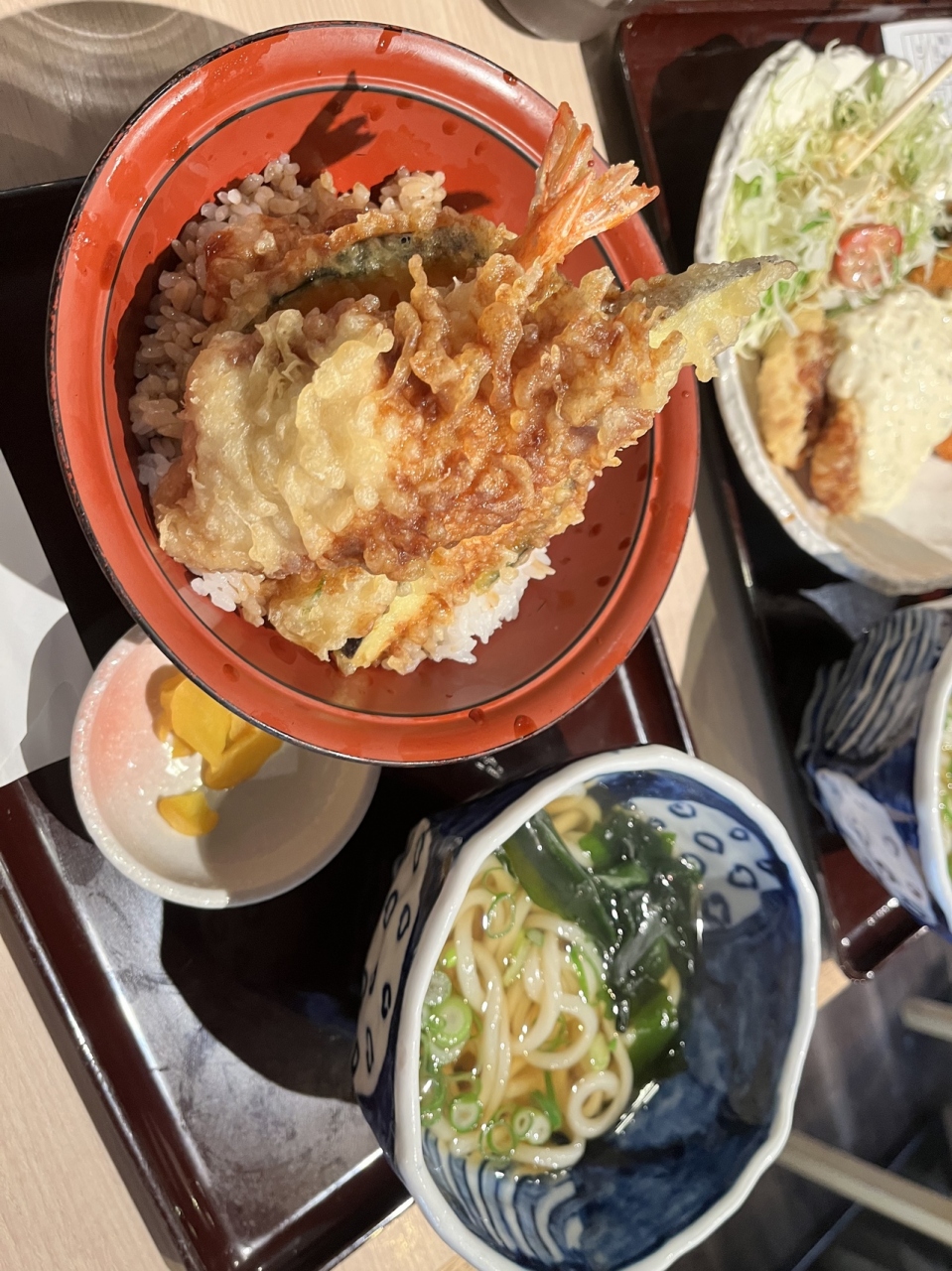 日曜13時半ごろ利用。結構空いてました。休日は天丼とミニうどんセットで890円。日替わり定食は790円とリーズナブルに食べれます。ちなみに平日は天丼のみで600円とよりお財布に優しい。