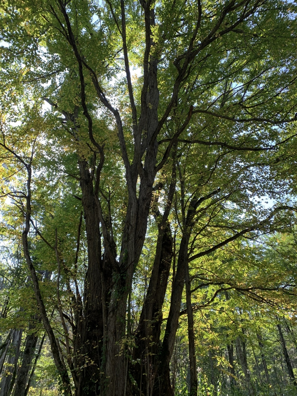 美瑛町から道道松山美瑛線で天人峡温泉方面に向かっていくと旭岳方面と天人峡温泉方面との分岐点に出ます。そこから道道213号線を天人峡温泉方面にさらに進んでいくと松山林道があります。林道を少し進むとゲートありその付近に5台分くらいの車を停めるスペースがありました。少しあるくとカツラの木がありました。存在感がすごいです。地上2~3m付近から発生した3本の主木が円形に合体して、森みたいになっていました。