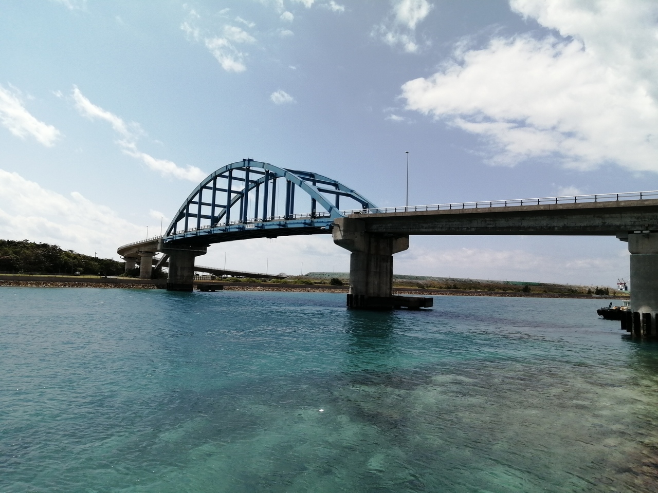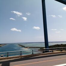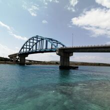 石垣市街と人工の埋立て地、南ぬ浜を繋ぐ大きな橋です。スカイブルーに塗られたアーチ橋は南の島にぴったり。石垣港離島ターミナルからは1km弱。歩いて行ってみました。ちゃんと歩道もあるので歩いて渡ることができます。橋の上からは想像以上の眺め。美しい海とサンゴ礁が見渡せます。