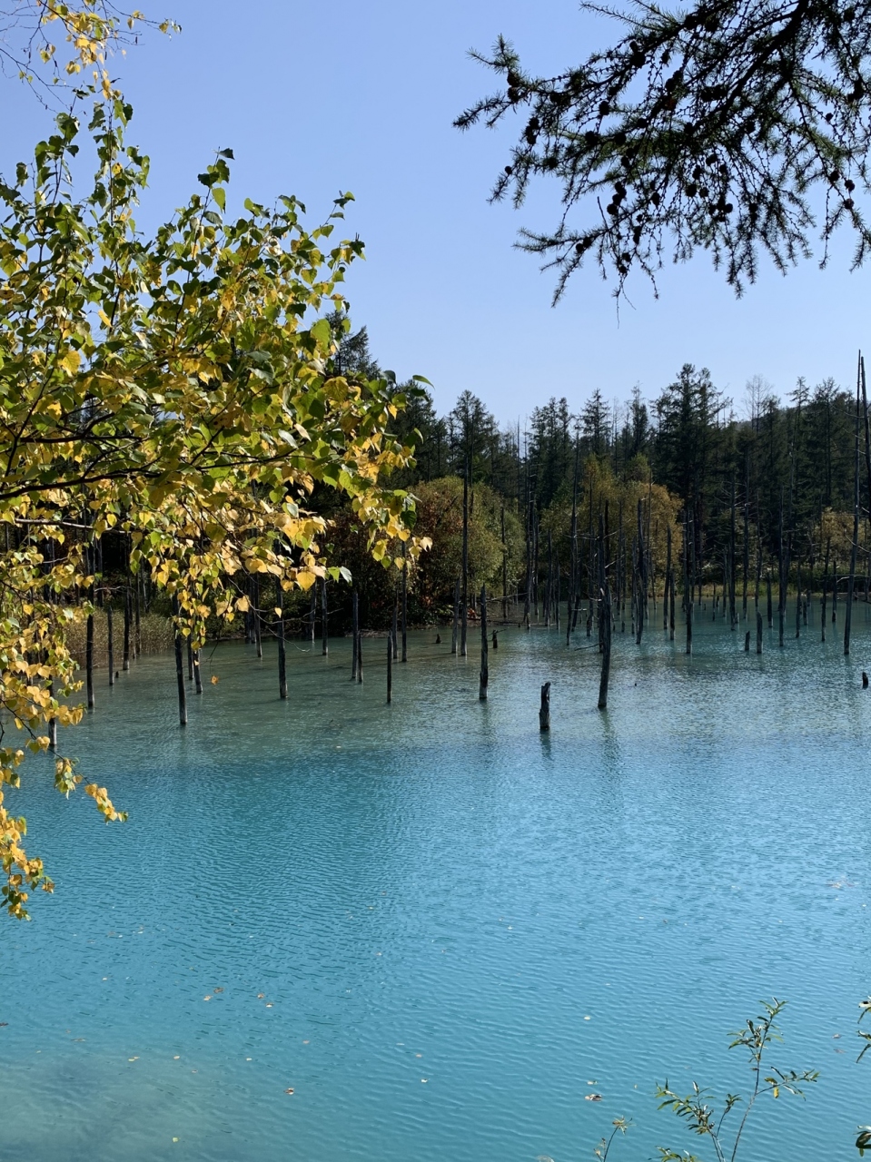 十勝岳の防災工事の時堰堤にたまった水が、不思議なほど青い色をしていたそうで実際に見ると青さに驚きました。ビエイブルーだそうです。付近の立ち枯れのカラマツがまた幻想的な雰囲気をかもしだして美しいです。ただ観光バスがひっきりなしに立ち寄るので混雑にゲンナリしました。