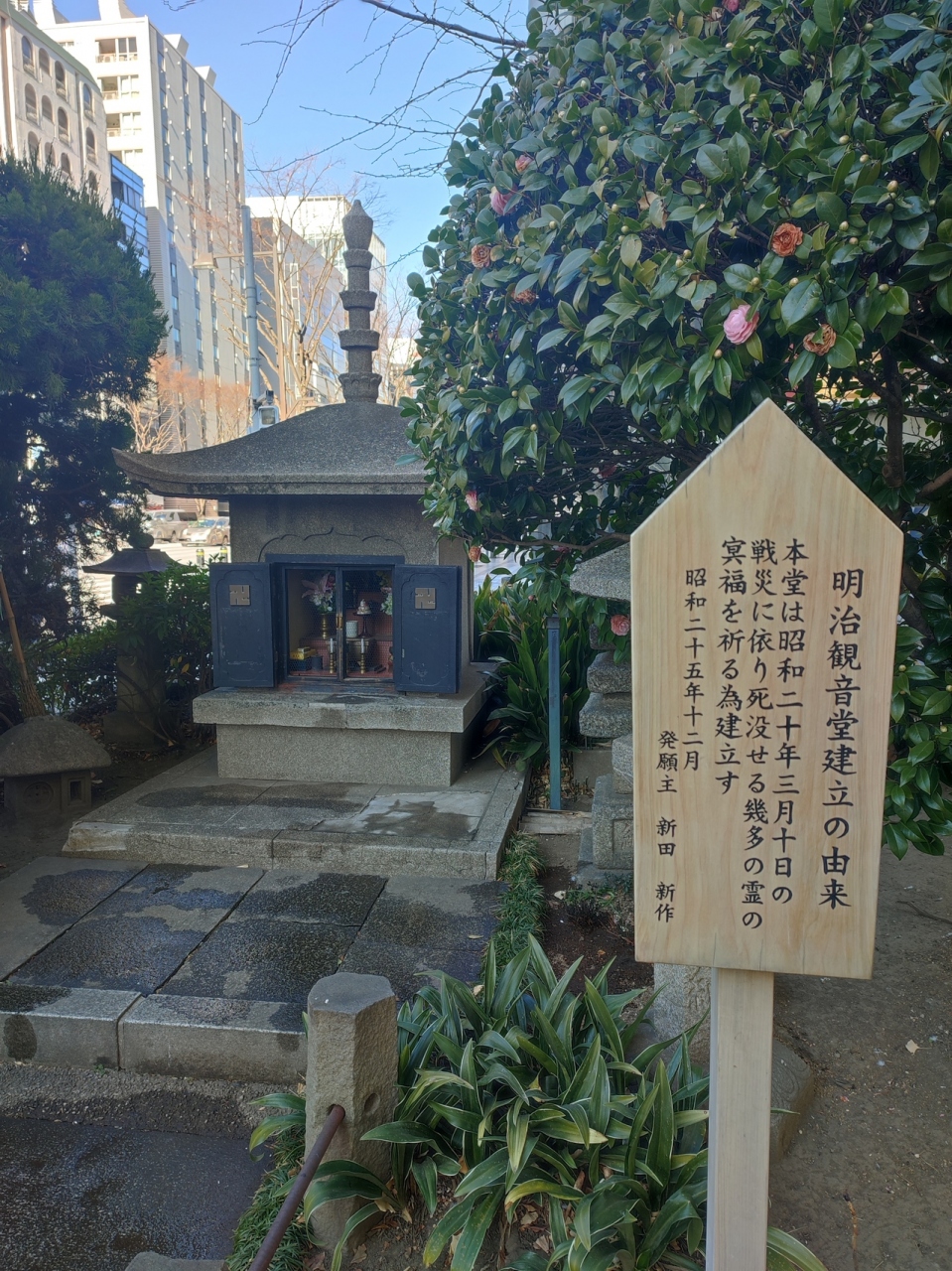 明治座のすぐ前、浜町公園の通路にあります。場所や名称的に、この前に見学した稲荷神社と同様に明治座に関連するのかと思ったのですが、東京大空襲で犠牲となった人々を弔うために建立された観音堂で直接の関係はない感じでした。