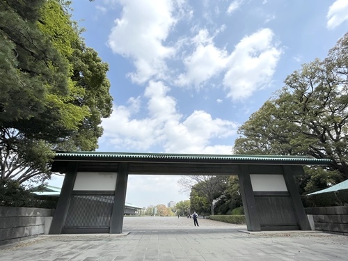 こちらは江戸城の遺構ではなく、1968年(昭和43年)に竣工した皇居宮殿に属する建築です。幅は10mほど。一般参観でとても横長の長和殿の前を通り、正門鉄橋・伏見櫓のビュースポットへ向かうときにくぐります。参賀の際に大勢が通ることを想定したのか、機能重視という感じでくわしい説明はありませんでした。ただ巨大建築に反応してシャッターを押しましたが、警備担当者に団体行動を乱す参加者がいないか、じっくり観察されていました。まあそういったものものしさも一般参観の魅力、としましょう。