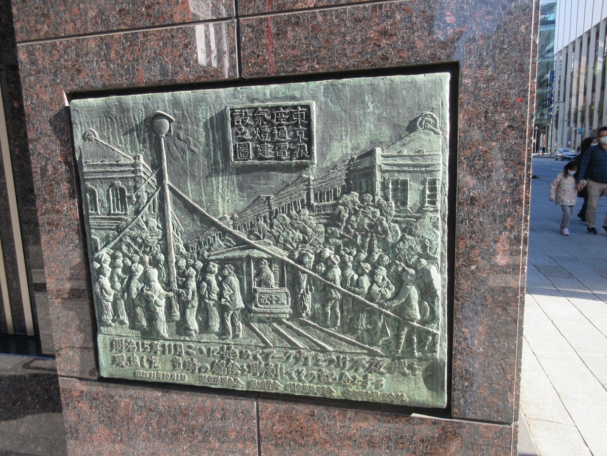銀座中央通りから、銀座2丁目のマロニエ通りに入る角地に建つビルの外壁に、【電気灯柱記念碑】があり目に留まりました。「明治15年にアーク灯を立てて不夜城を現出した」との文字と、驚きを隠せない人たちの様子を表現した青銅製のレリーフで、日本の最先端を走っていた銀座の様子が目に浮かぶようでした。
