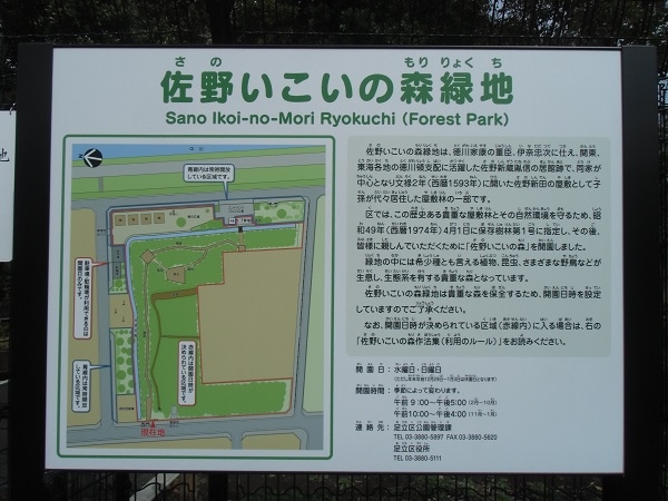 佐野いこいの森緑地はその昔、徳川家康の重臣だった伊奈忠次に仕えたと言われている佐野信蔵胤信の居館跡です。