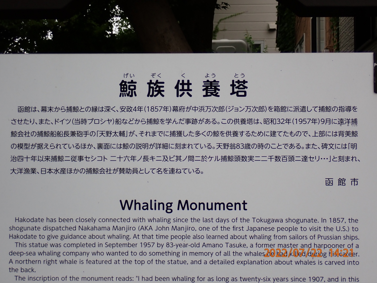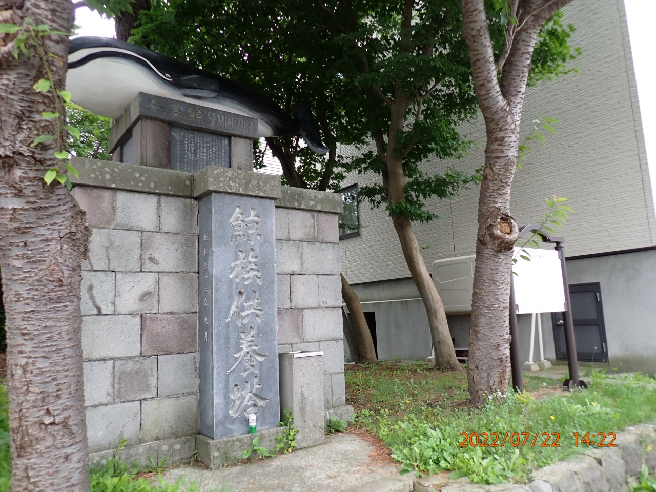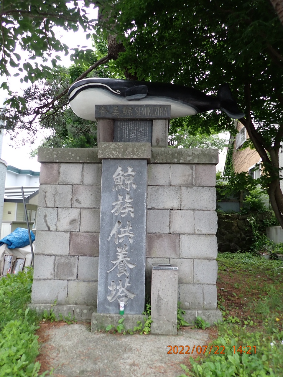 函館市観光で立ち寄りました。鯨族供養塔は、千歳坂を上り切る手前にあります。東本願寺函館別院船見支院に着く手前の左側にひっそりと建っています。説明板によると、函館は幕末から捕鯨との縁が深く、幕府がジョン万次郎を函館に派遣して捕鯨の市道をさせたり、ドイツ船などから捕鯨を学んだ事跡があるとのことです。塔の上に載っているクジラはセミクジラ(背美鯨)だそうです。