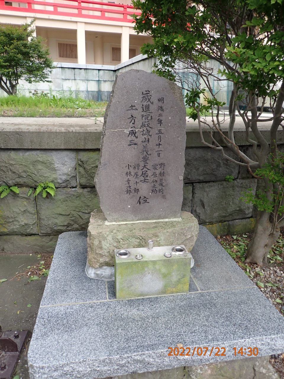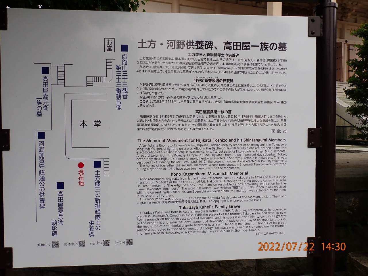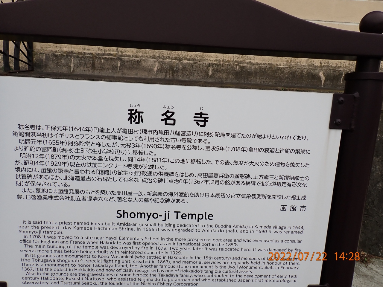 函館市観光で立ち寄りました。称名寺は、実行寺の隣にあった浄土宗のお寺で、開港当初は英仏の仮領事館が置かれるなど、頻繁に歴史に登場したお寺で、境内には新選組副長・土方歳三の供養碑や著名人の墓も多数あるとの説明板に記されてました。土方歳三と新撰組耐震供養碑はすぐ見つかりました。