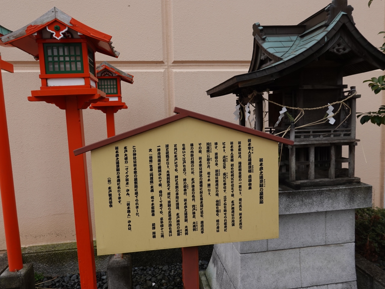 「真木彦之進景嗣 屋敷跡」は、水戸京成パーキングプラザの一画に案内板が設置されているのみです。案内板自体は目立ちませんが、神社の境内に設置されており、赤い鳥居が目印になります。真木彦之進景嗣は、江戸時代末期の水戸藩士ですが、案内板に、“水戸大使の「マイク眞木」さん、「眞木蔵人」さんは、真木彦之進景嗣の末裔にあたります”と記載があったのには驚きました。