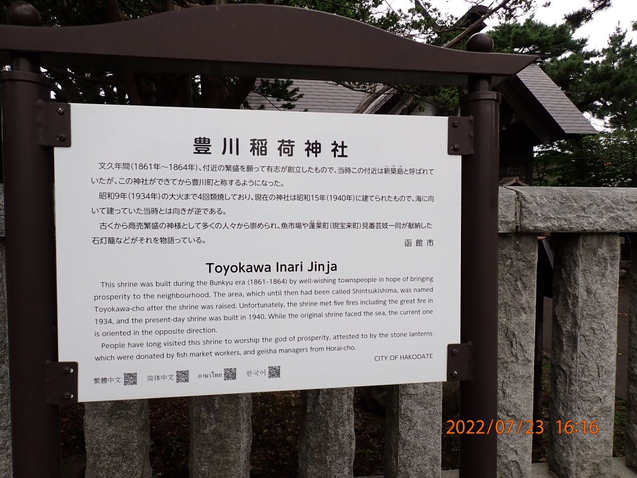 函館市観光で立ち寄りました。豊川稲荷神社は、開港通り沿いにあった神社で、文久年間に付近の繁盛魚願って有志が創立したと説明板に記されてました。現在の神社は1940年に建てられたもので、それまでに大火で4回も類焼しているそうです。建てた当時は海に向かって建っていたそうですが、現在の建物の向きは当時と逆向きとのことです。理由は書いてませんでした。