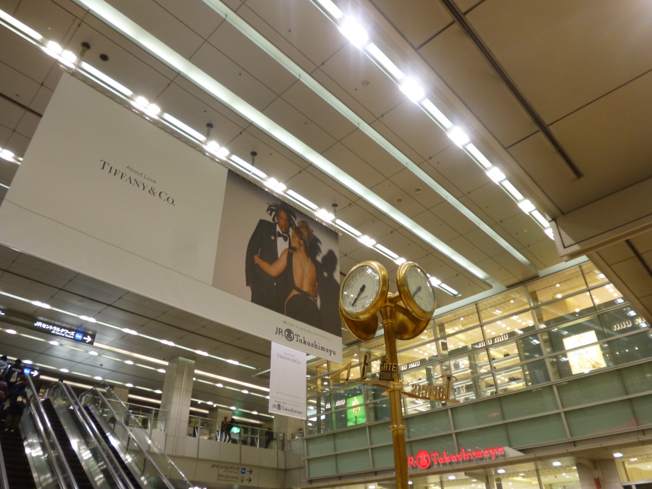 JR名古屋駅中央コンコース、桜通口へ向かところにあるのがこの金の時計です。駅ビル「JRセントラルタワーズ」の完成3周年を記念して2002年に建てられた割と新しいものです。背の高い金の時計は遠くからも見やすく、最適な待ち合わせ場所になっているようで、いつ通っても結構人が立っています。