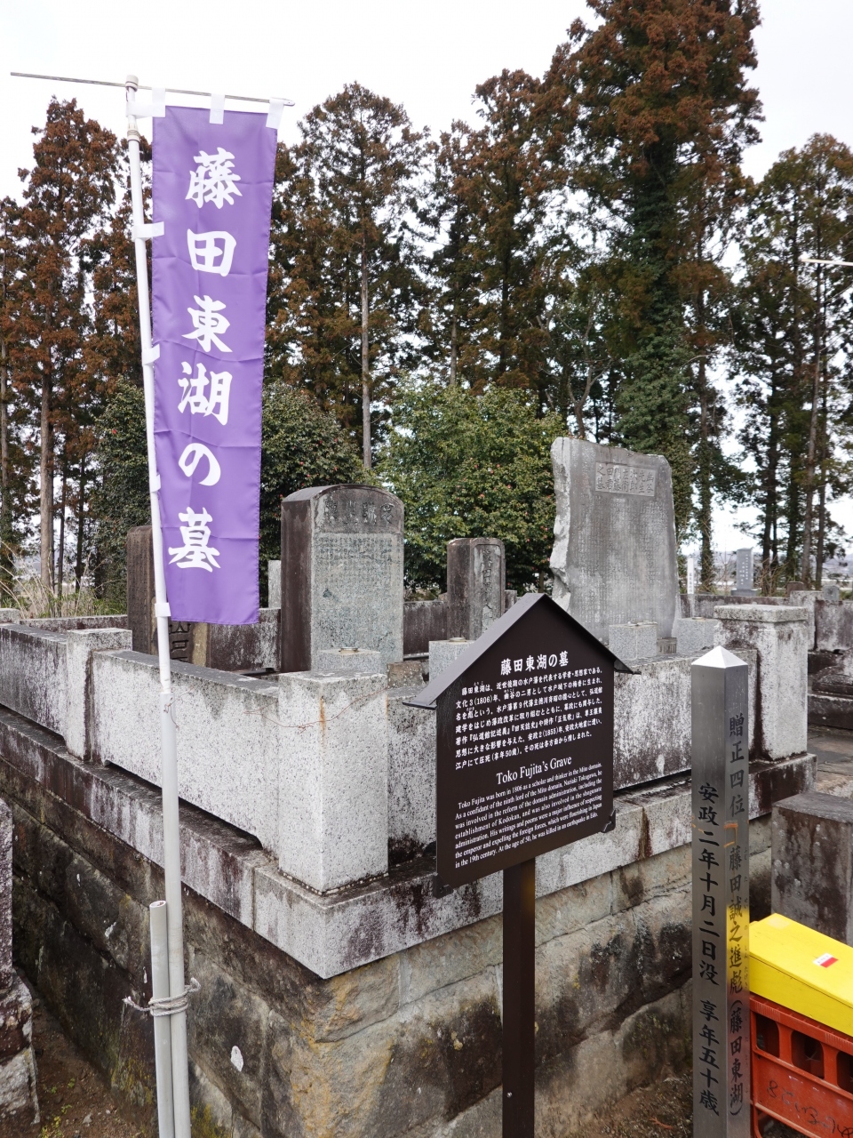 江戸時代末期に活躍した水戸藩士・藤田東湖の墓は、回天神社の裏手にある常盤共同墓地の中にあります。同じ共同墓地には格さん(安積澹泊)の墓もあります。藤田東湖の墓の前には紫色の幟と案内板があり、すぐにわかりました。案内書きには50歳の時に地震で圧死したとあり、初めて知る衝撃の史実でした。