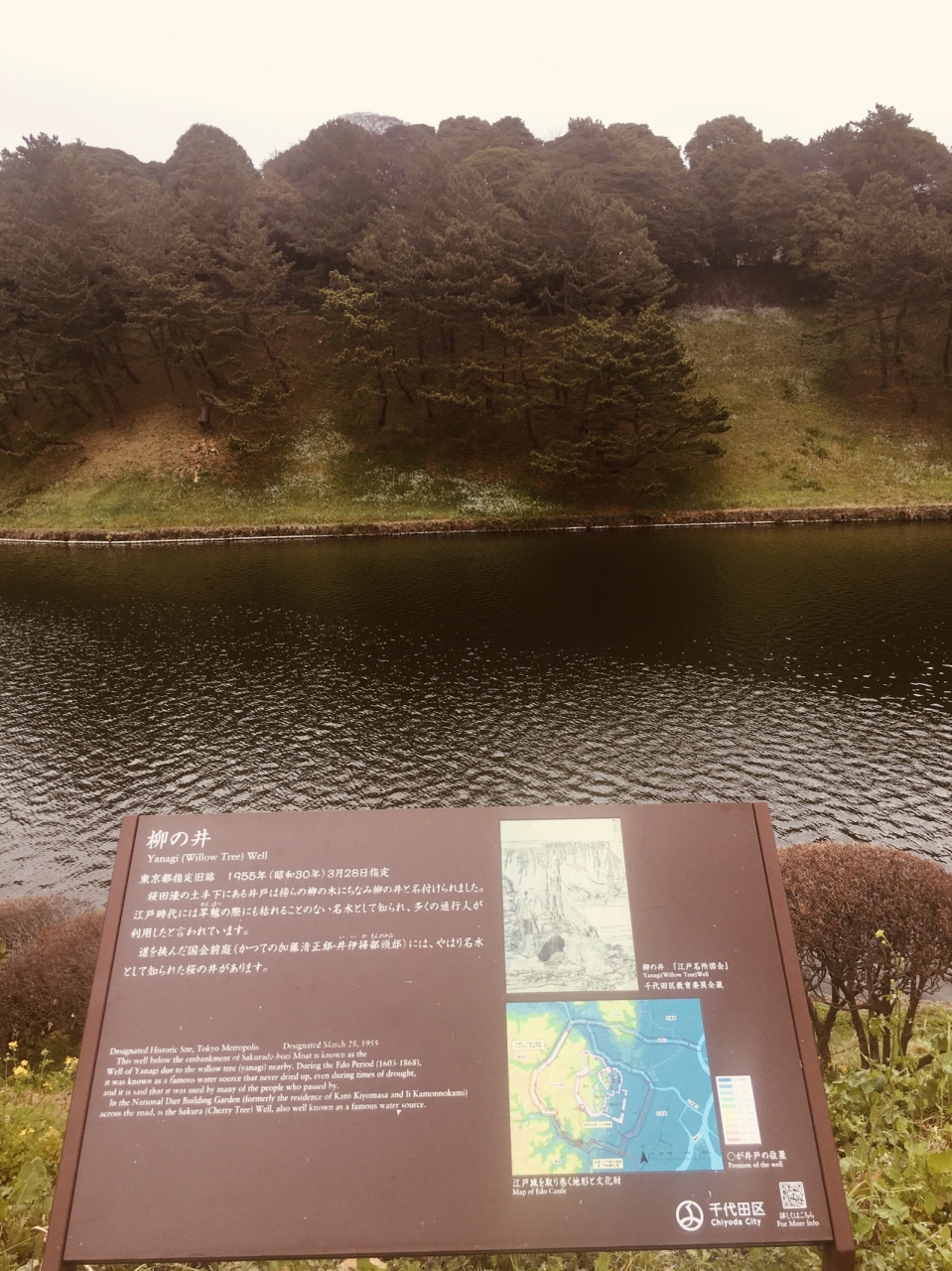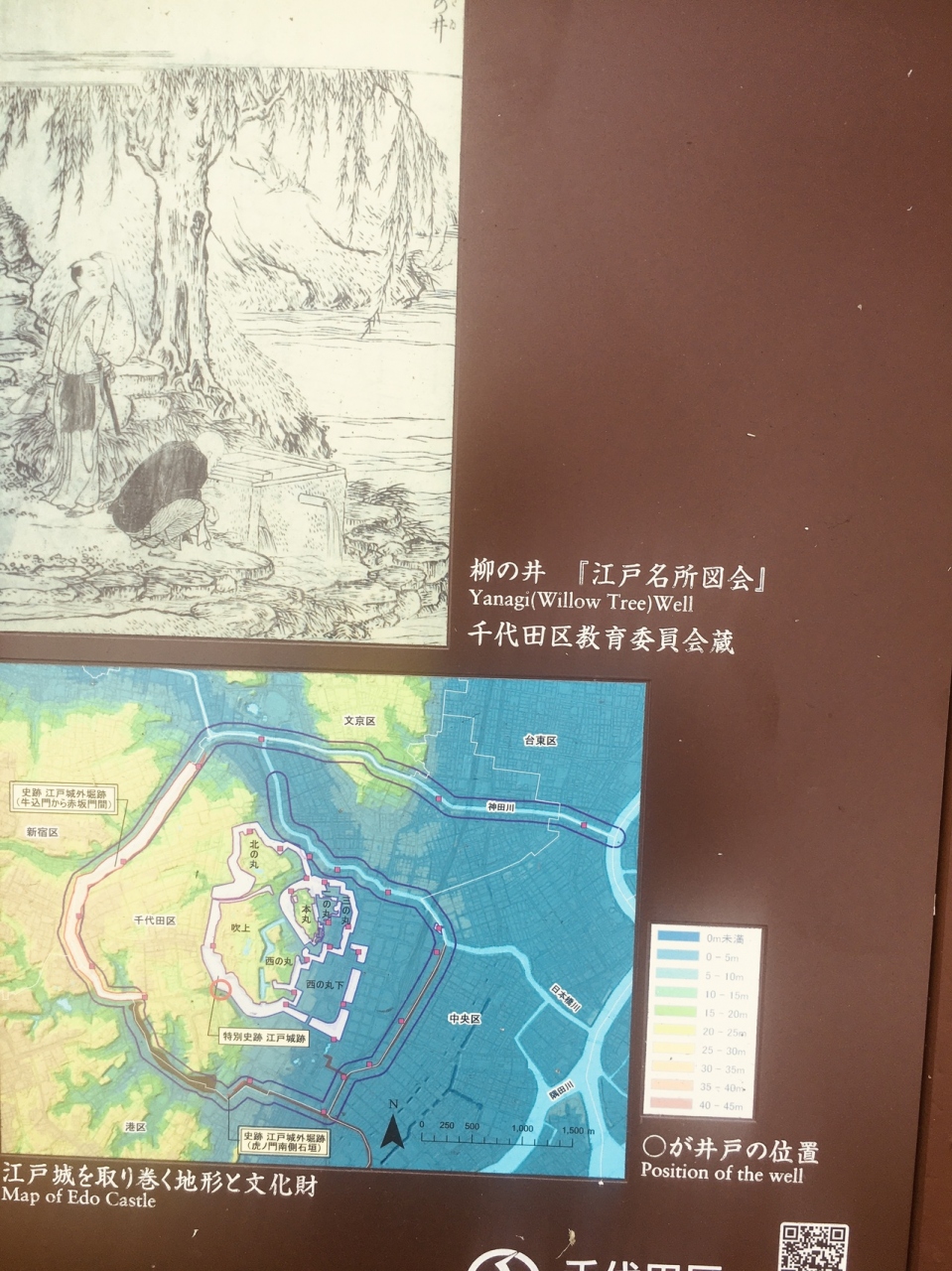 三宅坂沿いの内堀通り沿いの歩道にありました。説明看板があり、江戸名所地図に記載され川沿いの柳の木の下に井戸が描かれていました。看板の横には階段があり、皇居濠まで降りれるようになっていて、今でも当時の井戸がありそうな雰囲気でした。