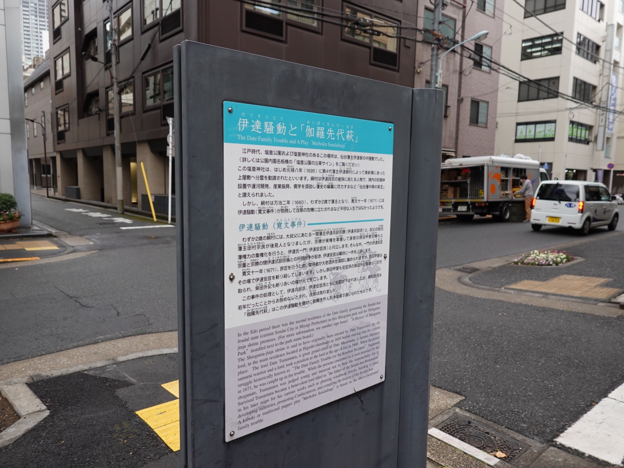 塩竈公園のシェアサイクルポートの近くに案内板が設置されています。この近辺は仙台藩主伊達家の中屋敷があった場所で、伊達家をめぐる伊達騒動は、歌舞伎や浄瑠璃の演目の題材にもなったことなどが記されています。案内板は文字ばかりでイメージがわかないのが残念です。