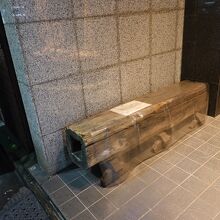 銀座の金春通り沿いの洋品店の前に「江戸時代の上水道管」があります。こちらは昭和42年に八丁堀のビル建築現場から出土した物で、玉川上水の末端部の木樋ということです。訪れたのが雨模様の日だったので、ビニールを被せて展示されていたのが印象的でした。