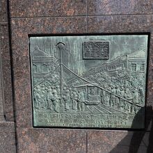 マロニエ通りと中央通りの交差点の北西側ビルの壁面にレリーフが埋め込まれています。レリーフには「東京銀座通電氣燈建設之図」と刻まれています。以前は夜に通りかかったので、細かな部分は認識できませんでしたが、昼間に見ると細かな情景描写がなされている魅力的なレリーフだと思いました。
