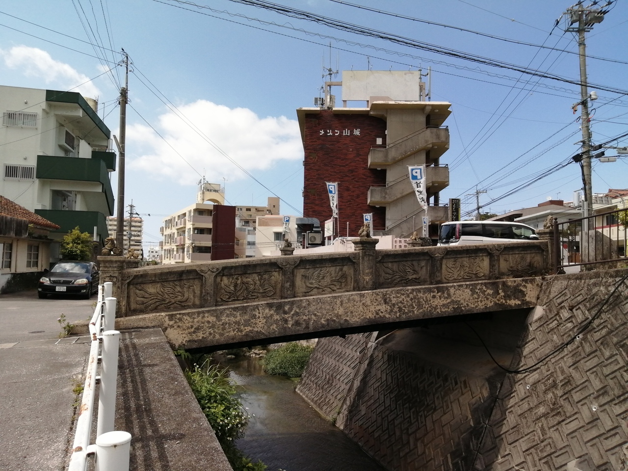 “カナズクバシ”と読みます。見るからに古めかしい橋ですが、シーサーが乗っていなければ気に留める方は少ないかなと思います。もともとは琉球王朝時代に造られた木造橋で、その後に石橋に造り変えられましたが戦争で破壊されてしまい、当時のものではないようです(昭和60年製)。橋の脇には説明板が設置されています。
