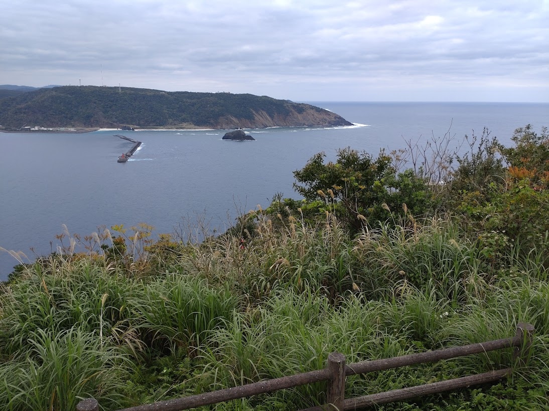 奄美空港に着陸する直前、機内から見た港町を、ここから一望できました。山に囲まれた海沿いに市街地が形成された様子がよくわかります。どんより曇っていて景色の美しさはいまいちでしたが、地形がわかって町に親近感がわきました。