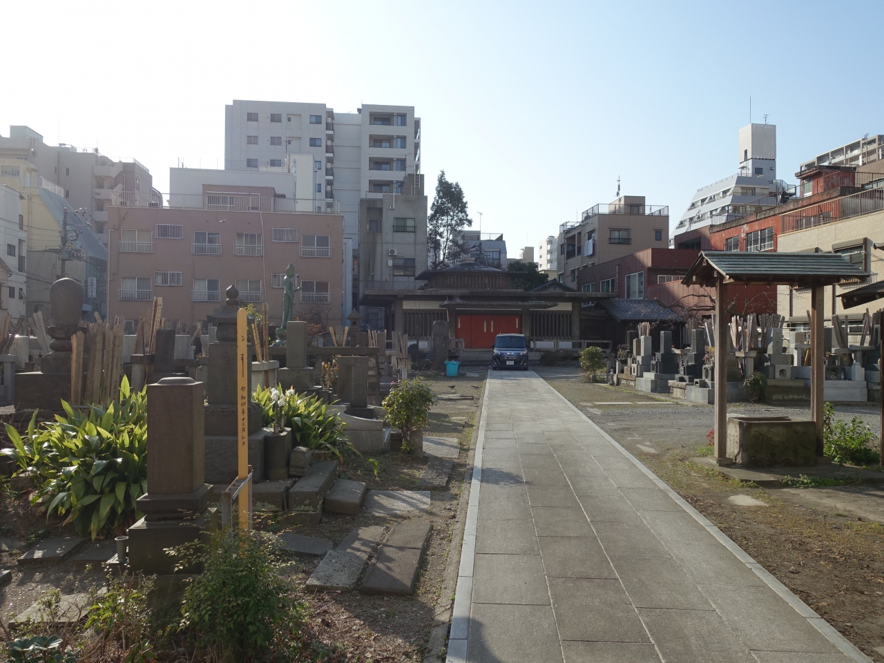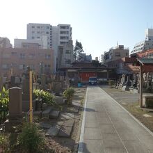 台東区の北のエリア、国際通り沿いの千束・竜泉には寺社仏閣が点在しますが、その中でも大恩寺はやや異質なお寺でした。標柱は国際通り沿いにありますが、その少し先に赤色をした鉄の門があり、閉じられていました。門の向うには石畳の参道が伸び、その先に本堂が見えますがそちらの扉も閉じられていました。参道の両側は大きな墓地ですが、参拝客の姿はなく、やや荒れた感じがしました。お寺全体に人の気配が感じられず、とにかく不思議なお寺という印象でした。