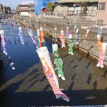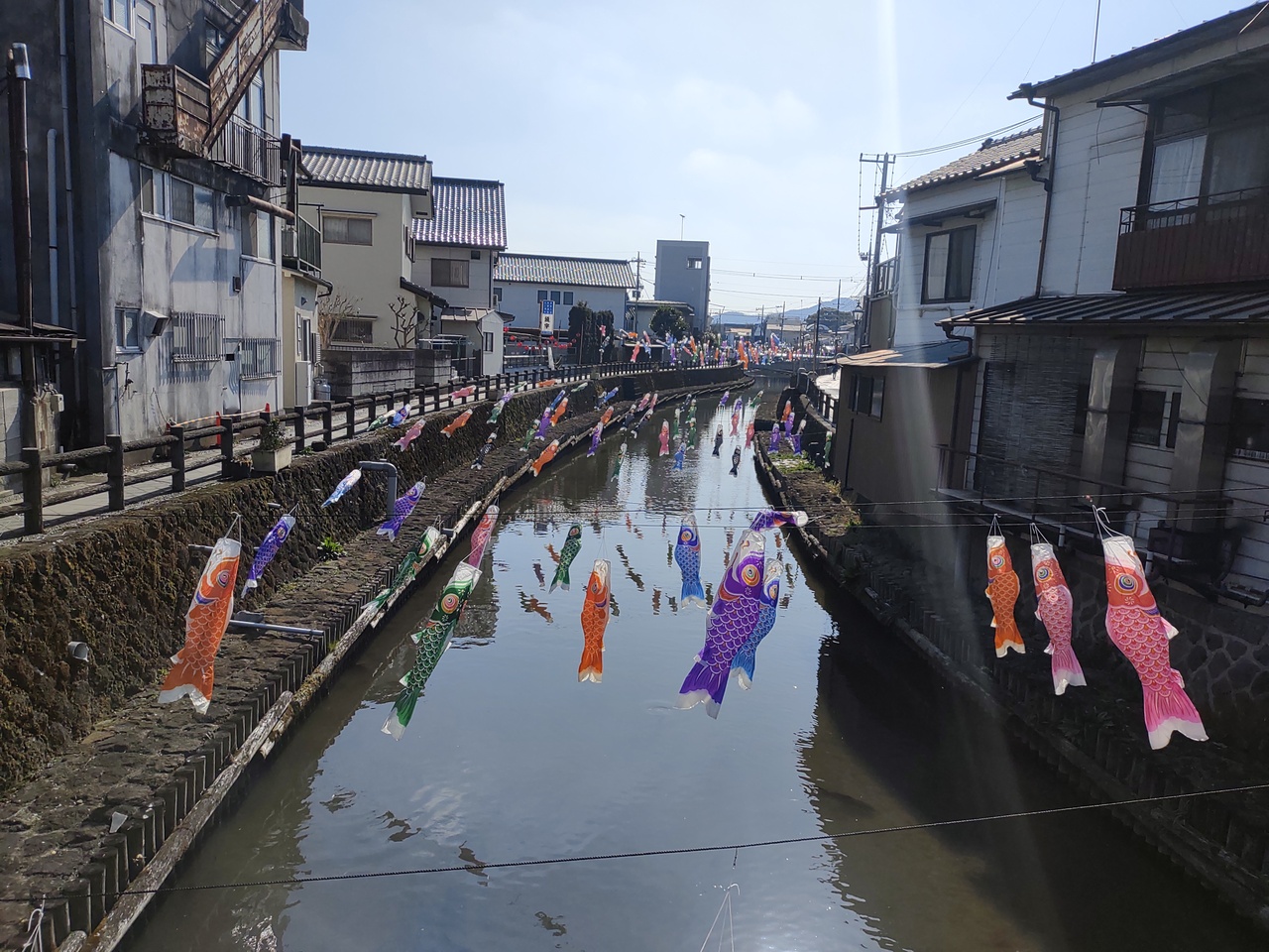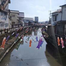 蔵の街を流れている川です。江戸時代は、この川を使って、江戸と間を物資を運んでいました。毎日訪れている観光客を必ず見かけますし、土日祝日はたくさんの方々が観光にいらっしゃっています。今は鯉のぼりが飾られています。