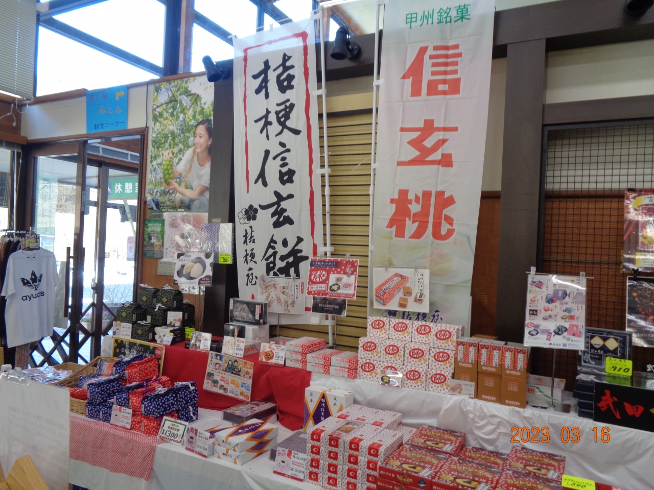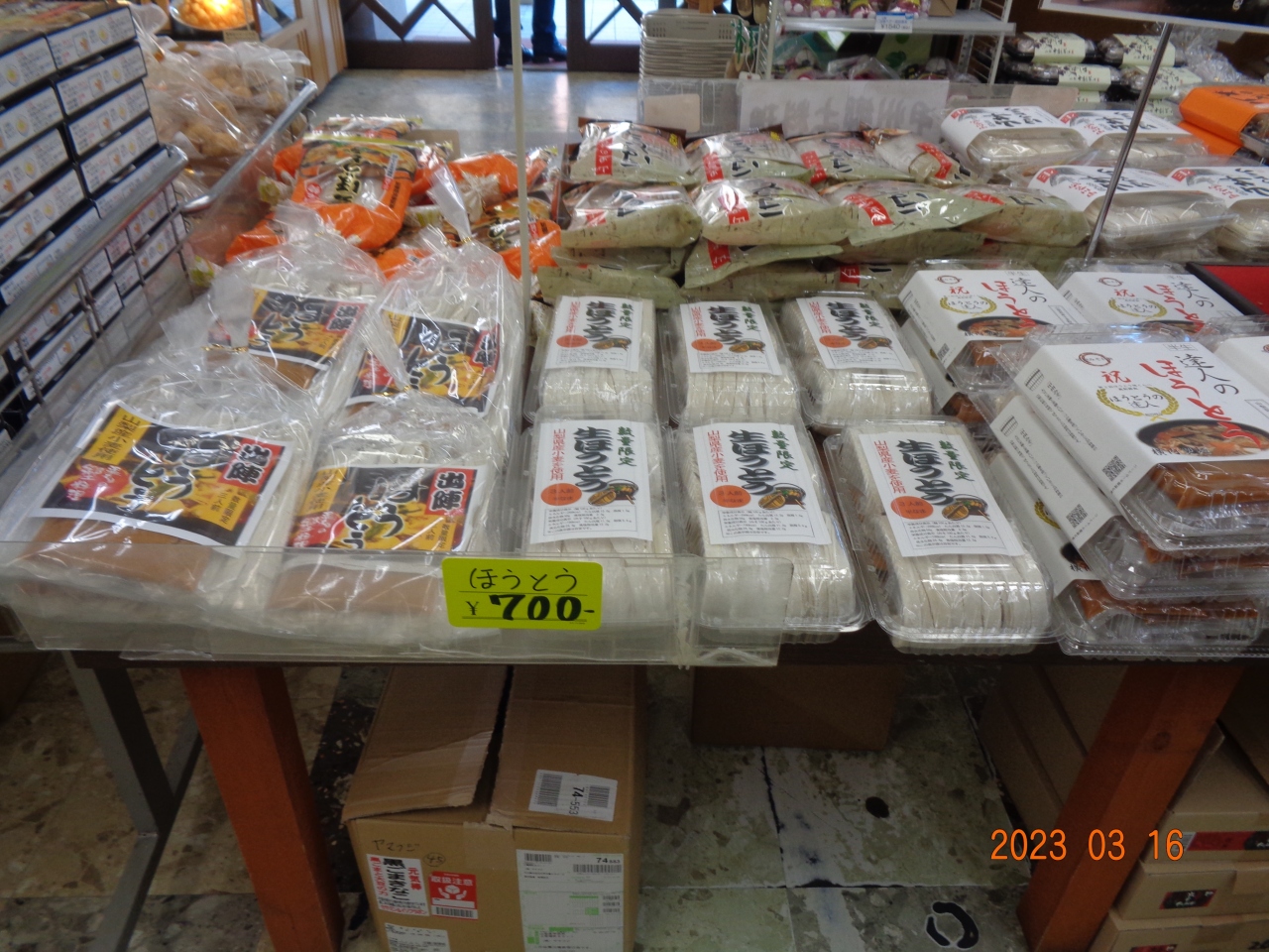 埼玉の道の駅とそれほど商品は変わらなく、すでにかなりお土産を買ったので迷いましたが、ここから山梨の名物「信玄餅」と「ほうとう」が売られていて小振りのを購入しました。