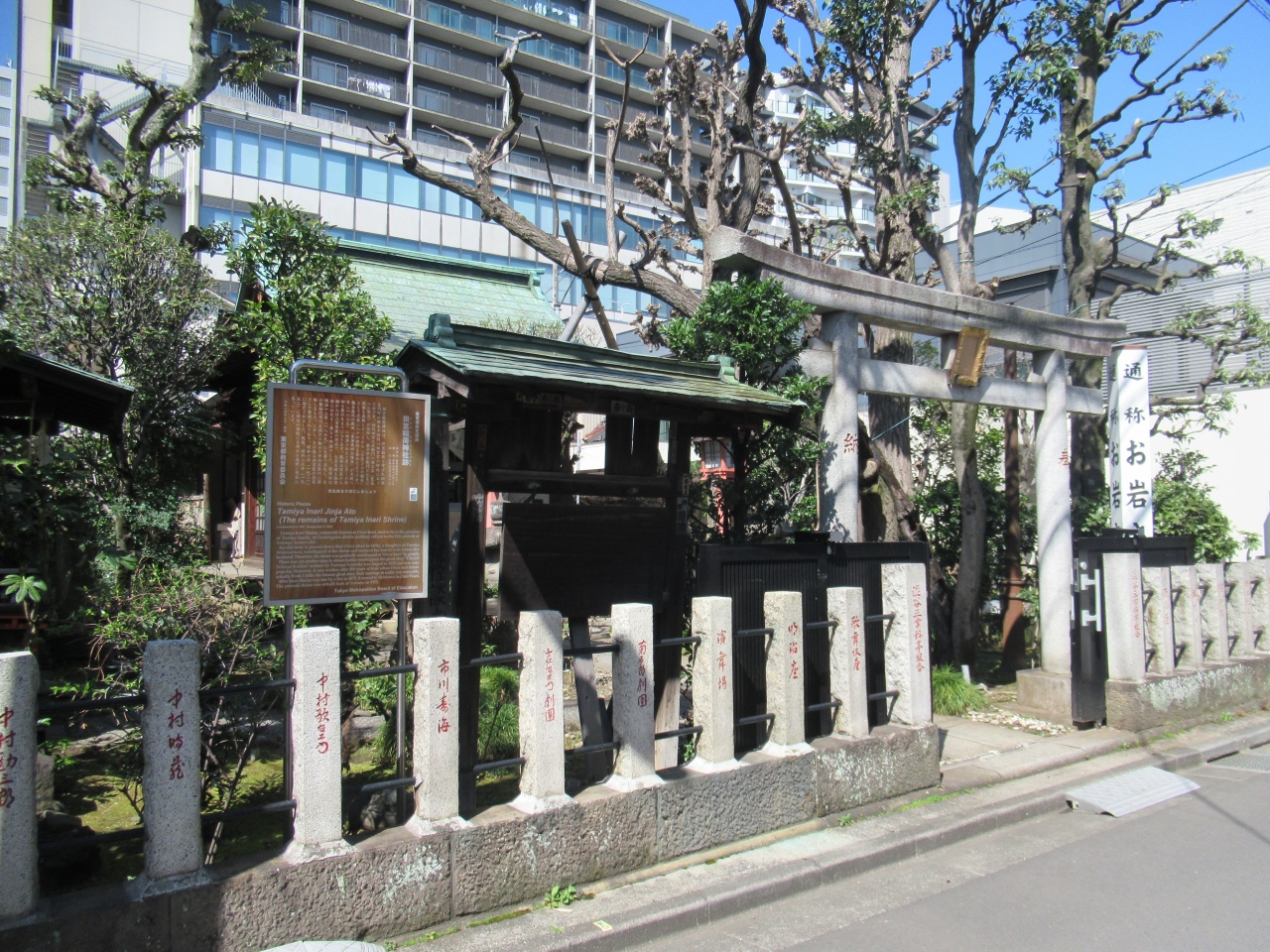 アニメ「君の名は」で知られる須賀神社から数分のところに建つ、左門町にある神社です。神社に置かれているプリントによれば、於岩というのは江戸時代に左門町で健気な一生を送った「お岩」という女性で、その女性の美徳を祀っている神社とのことです。徳川家の御家人だった田宮又左衛門の娘で、田宮家にあった屋敷社を信仰したことで、貧しかった生計を夫婦で復活させたそうです。その後、200年ほどして歌舞伎にも登場する人物になりましたが、善人という設定では面白くないということから、東海道四谷怪談というお岩とは全く異なる人物の脚本にし、歌舞伎で上演されるようになったとのことです。お岩さんは巣鴨の妙行寺に眠っています。
