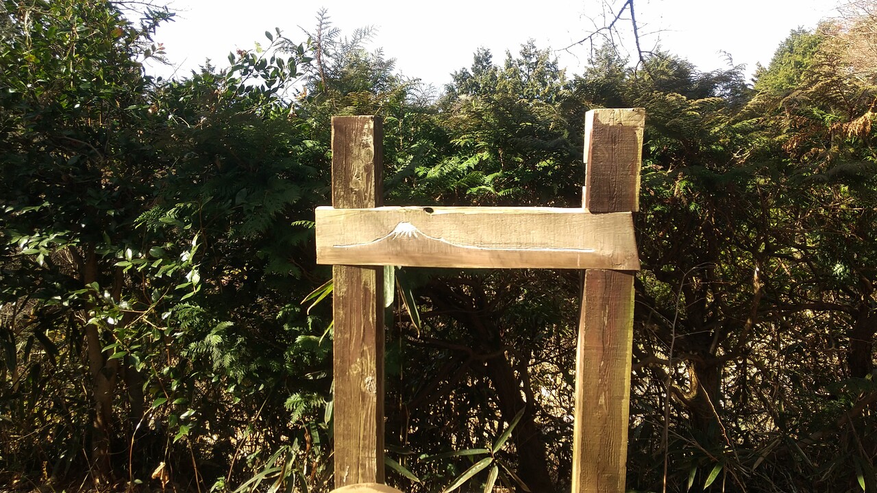 陣馬山から景信山への縦走路の途中にあります。廃れた感じの茶屋の裏側にまわると、山の絵が描かれた看板のようなものがありました。なんだろう?と思って、看板前の木の台の上に乗ってみると、富士山が見えました。(この日は残念ながらほとんど雲に隠れて、下の方だけしか見えませんでしたが) おそらくお天気の良い日はかなりきれいに見えると予想できる感じでした。陣馬山から景信山への縦走路はほとんど眺望がない道なので、明王峠からの眺めが癒しになります。