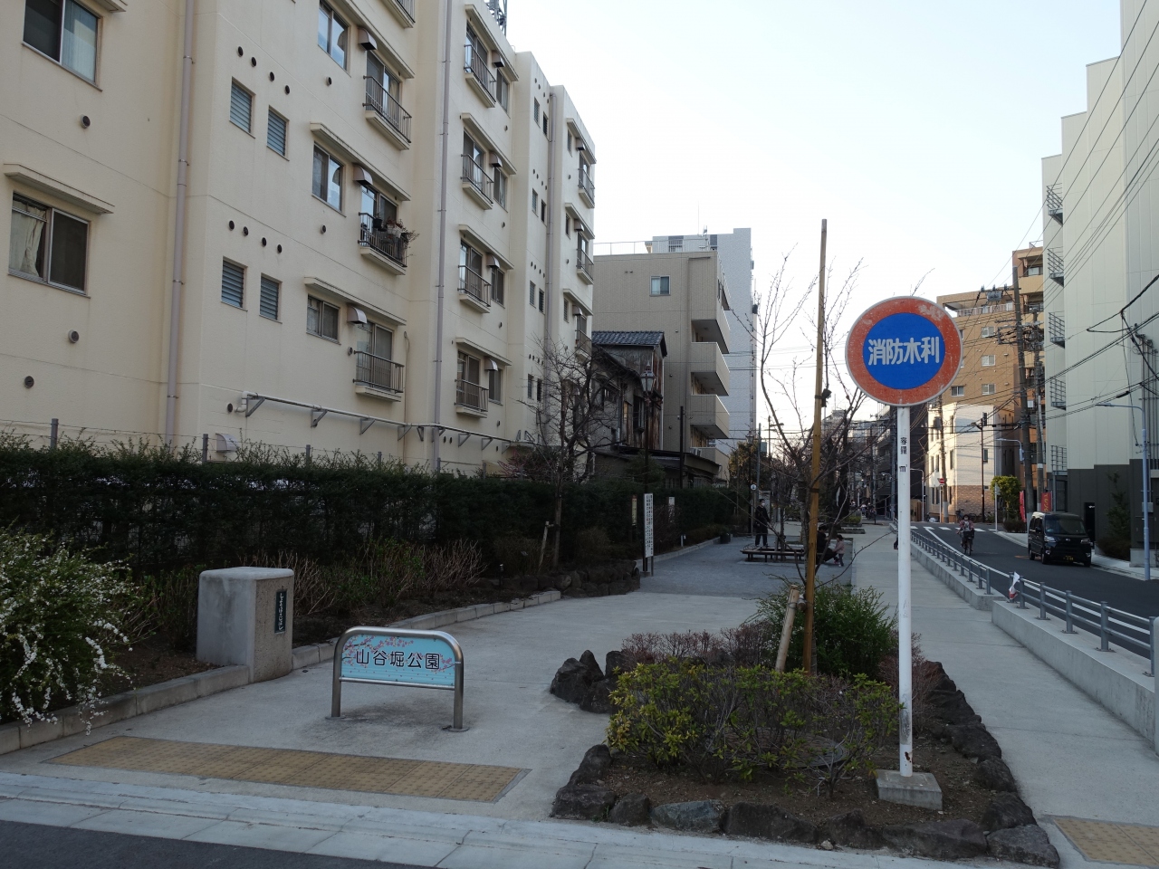 山谷堀公園はかつての水路を埋め立てて造った公園で、日本堤から隅田川入口までの約700メートルにわたる長細い形をしています。場所ごとに光景はことなりますが、スカイツリーを正面に眺められるエリアもあります。散策が楽しいですが、小学生らしき子どもたちが元気に遊ぶ姿も印象でした。