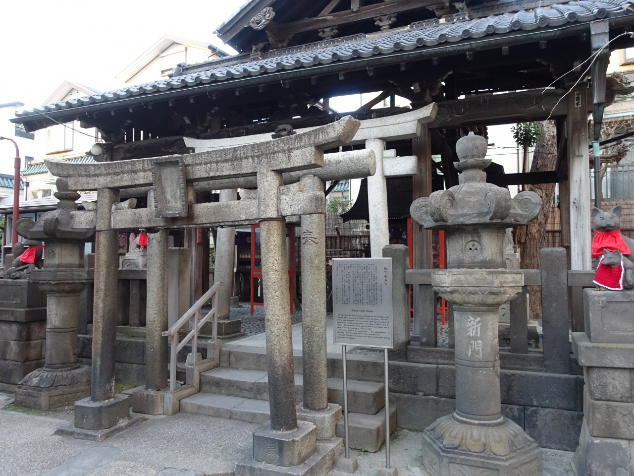 被官稲荷神社は浅草神社の境内社のひとつで、本殿の東北側にあります。この神社の特徴は、社は小さいものの、その前にある燈籠は大きく、また狭いエリアに3つの鳥居が連なるように建っている事です。五穀豊穣、商売繁盛、家内安全などにご利益がある神社ということで、地元の方々の厚い信仰を集めているのが感じられました。